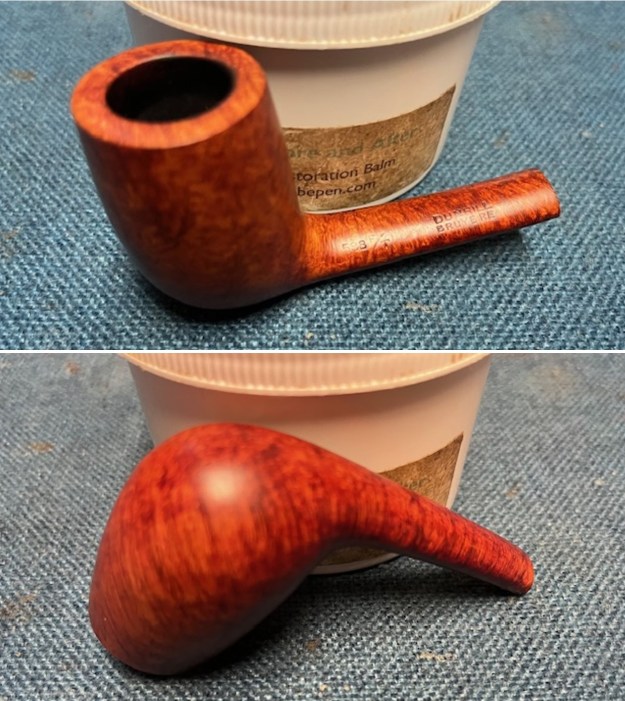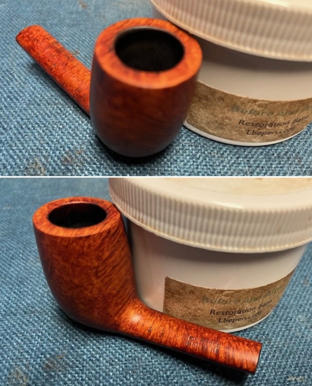 The Mr. Brog Pear Wood Bulldog no 34 turned out really well. I put the 9MM stem back on the shank and buffed it lightly with Blue Diamond to raise the shine. I gave the bowl and stem multiple coats of carnauba wax and buffed it with a clean buffing pad. I hand buffed the bowl with a soft cloth to deepen the shine. This chubby Pear Wood shape that Mr. Brog calls Bulldog no 34 is quite nice. The dimensions of the pipe are Length: 5 inches, Height: 1 ½ inches, Outside diameter of the bowl: 1 ¼ inches, Diameter of the Chamber: ¾ of an inch. The weight of the pipe is 1.87 ounces/53 grams. I will be putting it on the rebornpipes store in the Pipes from Various Makers section. If you are interested in adding this pipe to your collection let me know. Thanks for reading through my thoughts and reflections as I worked on this pear wood pipe.