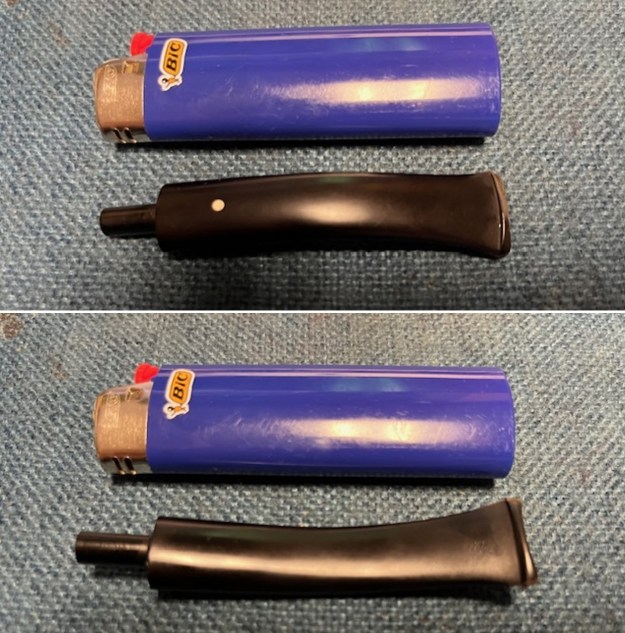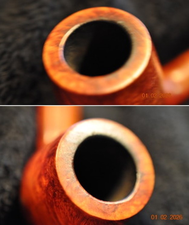 Armed with that information I turned to work on the pipe itself. Jeff had done a great job cleaning up the pipe as usual. He cleaned up the inside of the bowl with a PipNet reamer and a Savinelli Fitsall Pipe Knife. The rim top shows some damage on the top and the inner edge of the bowl. The bowl walls looked very good. He scrubbed the interior of the bowl and shank with pipe cleaners, cotton swabs and alcohol to remove the tars and oils. He scrubbed the exterior of the pipe with Murphy’s Oil Soap and a tooth brush to remove the grime from the finish. He worked on the rim top lava and darkening with the soap and tooth brush. He scrubbed the inside of the stem with alcohol and pipe cleaners. He scrubbed the exterior with Soft Scrub and then soaked it in Briarville’s Pipe Stem Deoxidizer. He washed it off with warm water to remove the deoxidizer. Now the damage to the stem was very clear. Overall, the pipe looked far better. I took photos of the pipe when I received it before I started working on it.