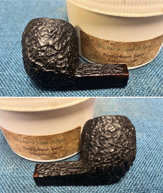 I rubbed the briar down with Before & After Restoration Balm. I worked it into the briar with my fingertips and a horsehair shoe brush. The product works to clean, enliven and preserve the briar. I let it sit for 10 minutes then I buffed it with a cotton cloth to deepen the shine. The briar really comes alive with the balm.