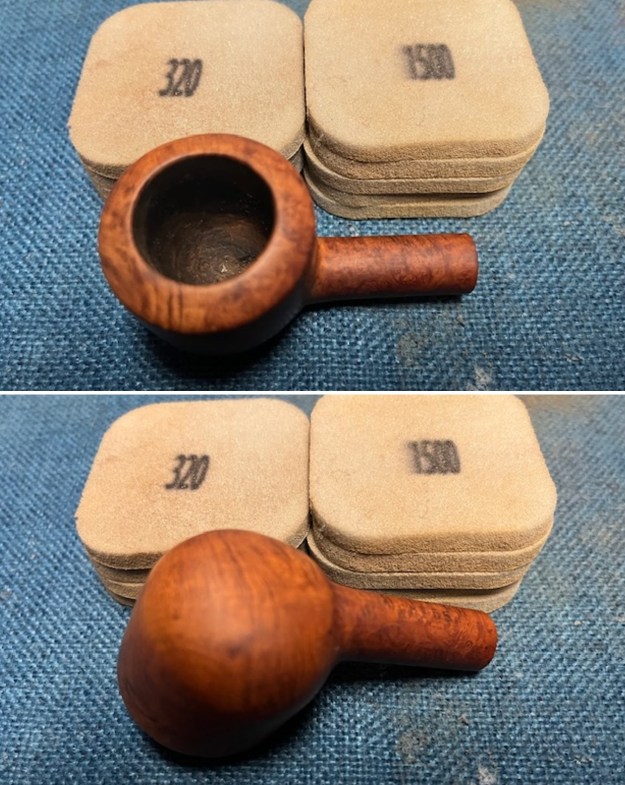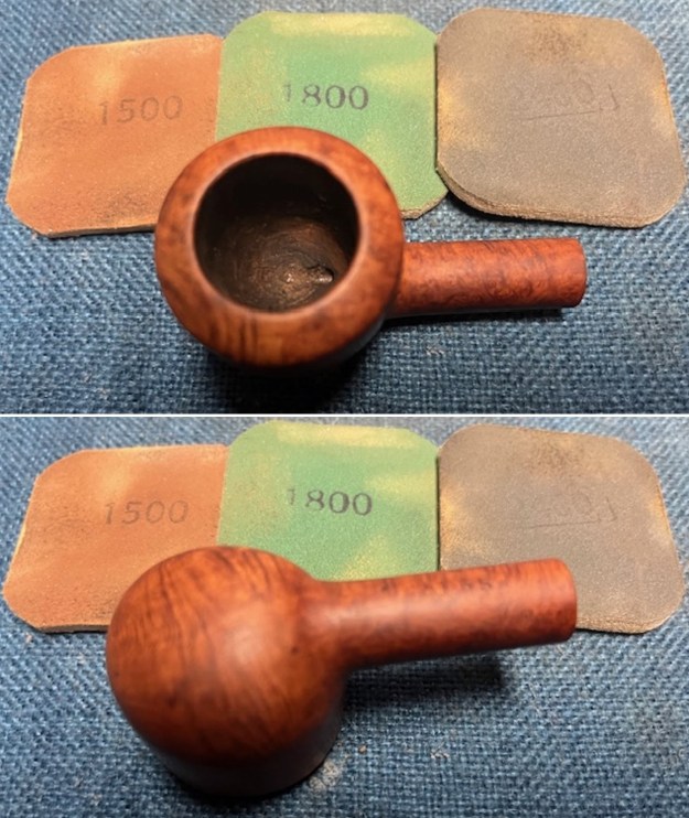 It was time to start my work on the pipe. I sanded the scratches and marks on the rim and bowl sides with 320-3500 grit 2×2 inch sanding pads. I wiped it down after each pad with a damp cloth. It really began to shine.