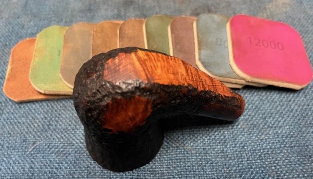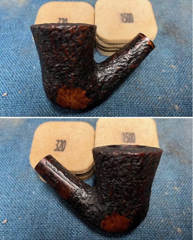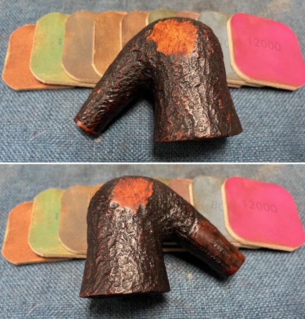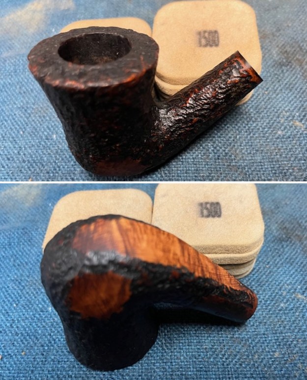 The condition of the bowl was excellent after the cleanup. The only thing that look like it needed work were the smooth patches on the sides and underside of the shank. They showed sanding marks and scratching. I would need to smooth out the marks and polish the smooth portions. I used 320-3500 grit 2×2 inch sanding pads to smooth them out. It looked much better.