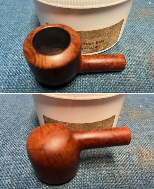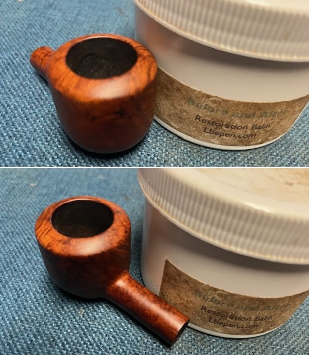I rubbed the bowl and shank down with Before & After Restoration Balm to deep clean the finish on the bowl and shank. The product works to clean, enliven and protect the briar. I worked it in with my fingers to get it into the briar. I let it sit for 10 minutes then I wiped it off and buffed it with a soft cloth. The briar really began to have a rich shine. I took some photos of the bowl at this point to mark the progress in the restoration. It is a beautiful bowl.