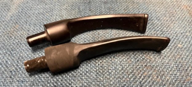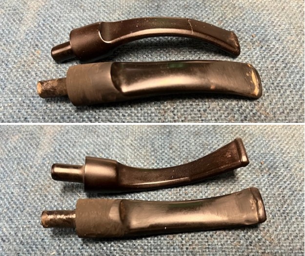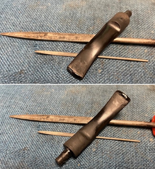 To replace the stem I need to find one that would work. I went through my stems and found one that look workable. It was a little larger in diameter at the saddle than the broken one but with some work it would fit well. I reduced the diameter of the tenon and the diameter of the saddle portions with a Dremel and a sanding drum. I needed to sand out the sanding marks and make the fit smooth to the shank and mortise.