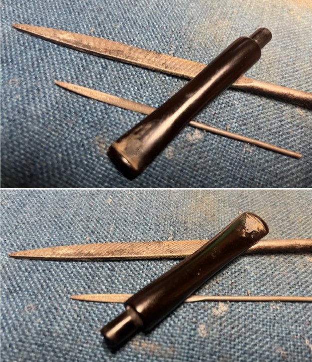 I set the finished bowl aside and turned my attention to the stem. I filled in the deep tooth marks on both sides with black CA glue. Once it cured, I flattened the repairs with small flat files. I sanded the surface with 220 grit sandpaper to further blend it in. It looks good.