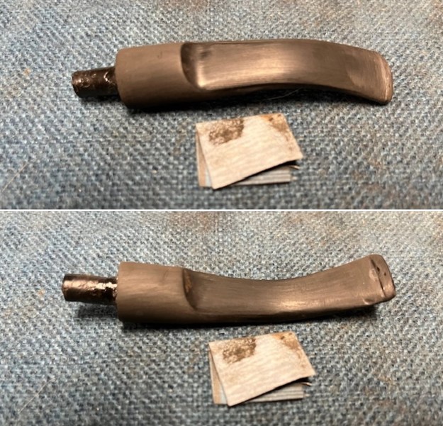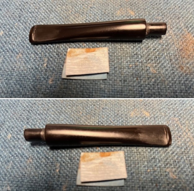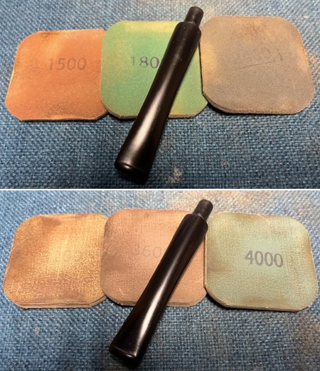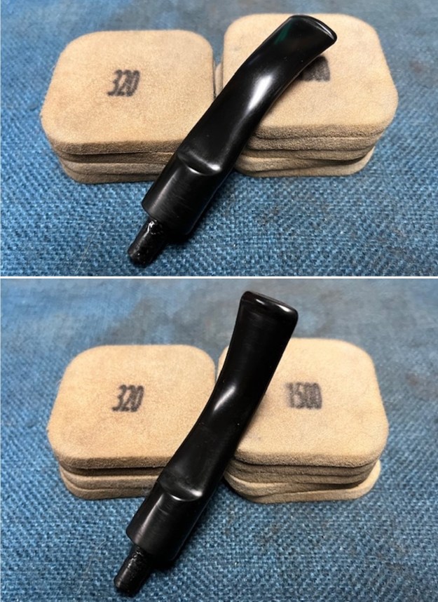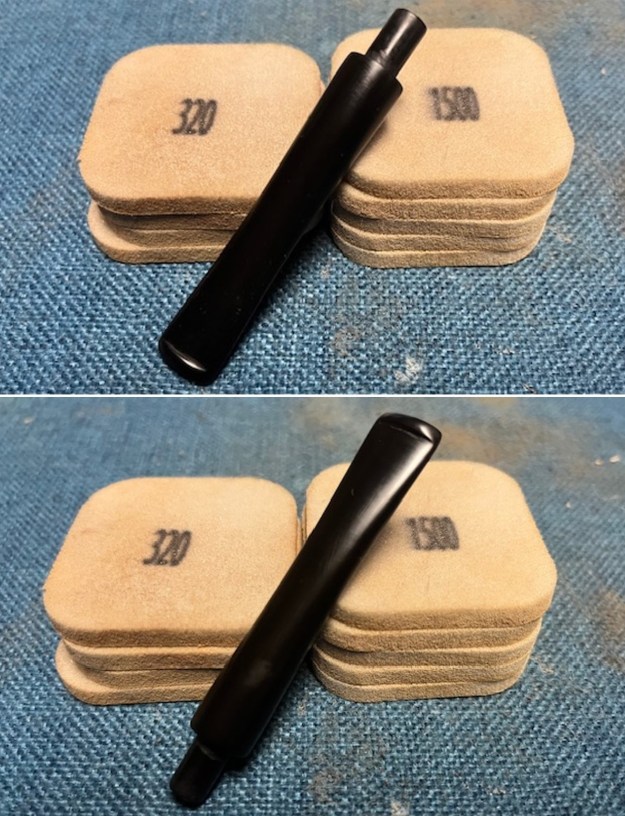 I sanded the stem with 2 x 2 inch sanding pads – dry sanding with 320-3500 grit pads and wiping it down after each pad with an Obsidian Oil cloth.