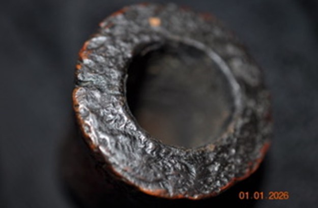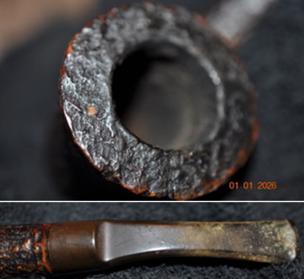 I took a photo of the bowl, rim top and the stem to show their condition. Jeff was able to clean up the cake and the lava overflow that was shown in the rim and bowl photos above. The rim top was clean and the inner and outer edges of the bowl showed no burn damage. The stem looked better and the tooth marks are very visible on both sides ahead of the button. There was also a hairline crack in the topside of the stem mid blade.