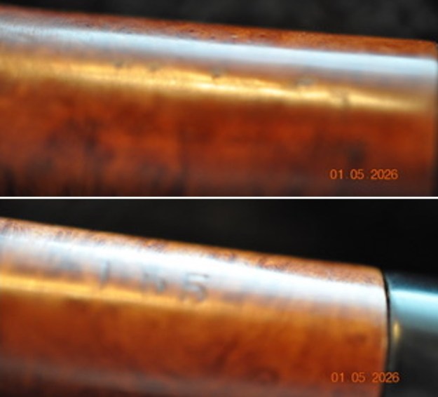Jeff took photos of the stamping on the left side and it is faint but readable as noted above. The stamping on the underside of the shank shows the shape number. It faint but still readable.