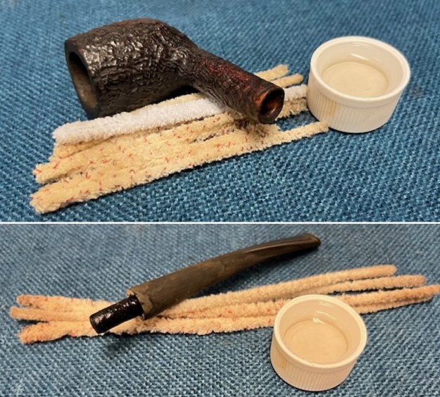 I cleaned out the internals of the shank and bowl with pipe cleaners, cotton swabs and isopropyl alcohol. The pipe is very clean. I like it clean to make a better fit for new stem. I cleaned out the airway in the stem I had chosen with pipe cleaners and alcohol.