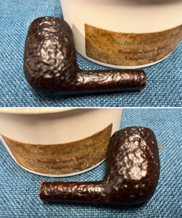 I worked some Before & After Restoration Balm into the surface of the briar with my finger tips and a shoe brush to work it into the sandblast. The product is incredible and the way it brings the grain to the fore is unique. It works to clean, protect and invigorate the wood.
