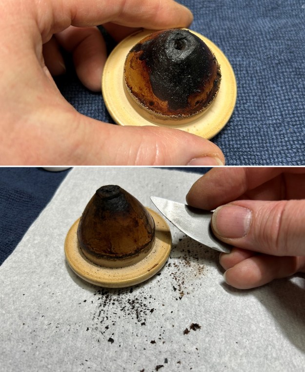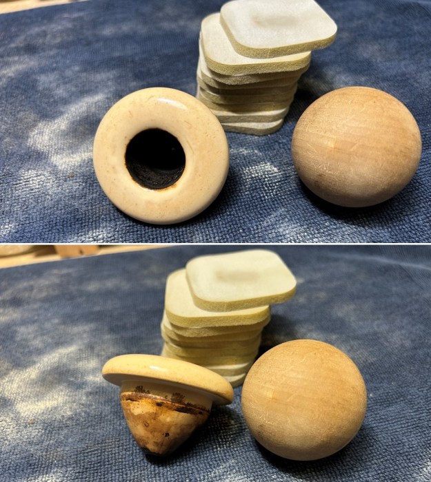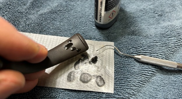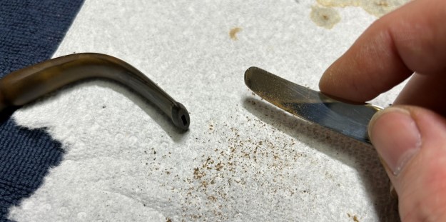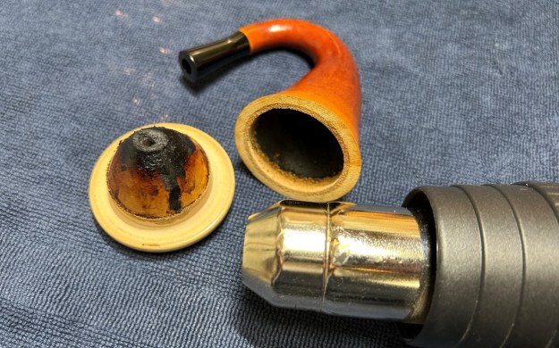 I set the bowl aside and turned to the stem. I “painted” the stem surface with the flame of a lighter to lift the tooth marks. I was able to lift some of them. I filled in the remaining marks in the surface with extra strength, rubberized CA glue. I set it aside to cure. I sanded the marks smooth with a folded piece of 220 grit sandpaper.