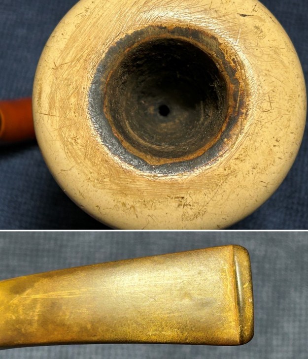 Jeff took photos of the rim top and stem to show the general condition of the pipe. The bowl is heavily caked so it is hard to know the condition of the edges under the lava overflow. The stem was oxidized, calcified and had tooth marks on the top and underside.