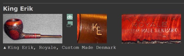 King Erik pipes were advertised as “Hand Made by Danish Craftsmen” and as made in Denmark. Primarily offered in a two tone combination smooth and sandblasted finish, the pipes were marked with a KE on the stem. While the maker is unknown, it seems likely that these pipes were sold to the American market as intended competition for the popular pipes made by Erik Nørding, Karl Erik Ottendahl and others, especially given that the pipes are Danish, and the “King Erik” for which the pipes are named would seem to be Swedish, namely Erik Jedvardsson, King Eric IX of Sweden.