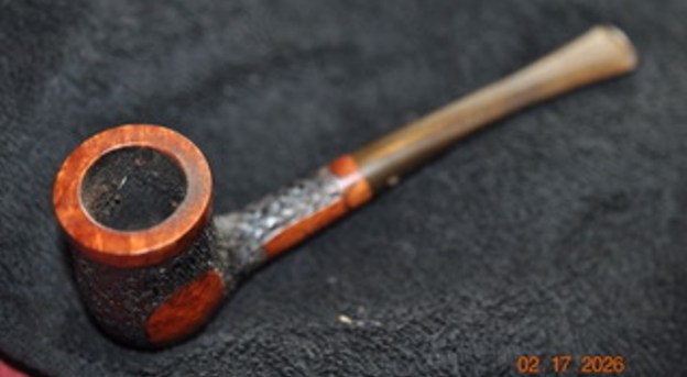 The next pipe on the table is a great looking rusticated Stack with a smooth rim top and band on the top and shank end as well as a smooth patch on each side of the bowl. It was one purchased on 01/20/2026 from a Facebook seller in Quaker Town, Pennsylvania, USA. The bowl and the shank are tightly rusticated. It is a great looking pipe. It is stamped on a smooth panel on the left side of the shank and reads King Erik [over] Custom Made [over] Denmark. On the smooth shank band it was stamped on the underside with the shape number 713. The finish was dirty and had a lot of grime and grit ground into the rustication and the smooth portions. The rim top and inner edge of the bowl is dirty with a light lava flow on the edge and the top that was heavier toward the back of the bowl. There is a thick cake in the bowl. The stem is dirty and has light tooth marks and chatter on the surface. It had the KE logo stamped on the left side of the taper stem. Jeff took photos of the pipe before he started his clean up work. It showed a lot of promise.