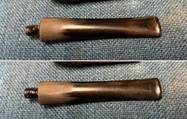 I polished the briar with 1500-12000 grit micromesh sanding pads to further remove the marks in the finish and to deepen the shine. I wiped it down with a damp cloth after each sanding pad to remove the debris. It looked much better.