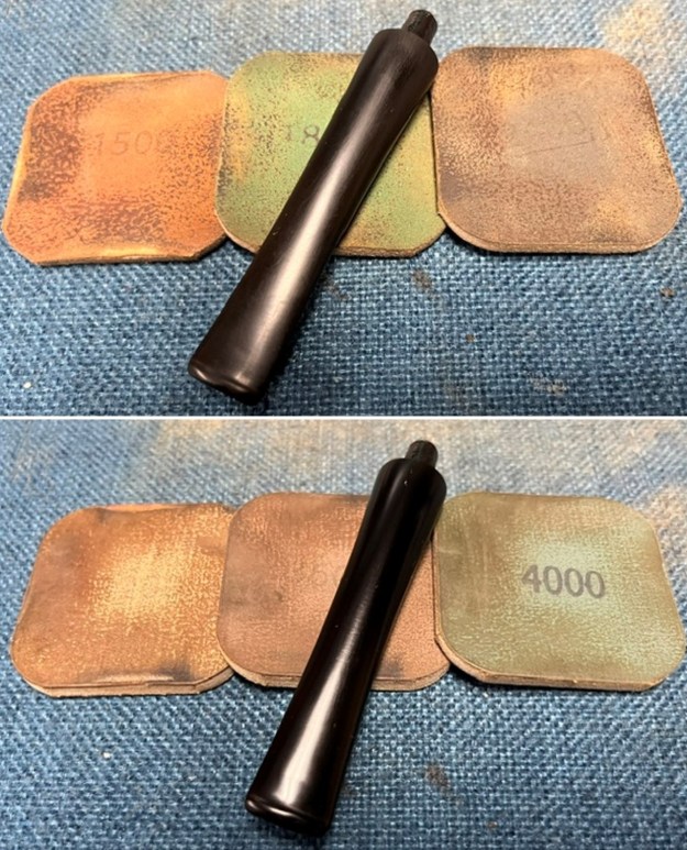 I sanded the bowl with 320-3500 grit 2×2 inch sanding pads to remove the scratching on the sides of the bowl and shank. I wiped the bowl down with a damp cloth after each sanding pad to remove the sanding debris.