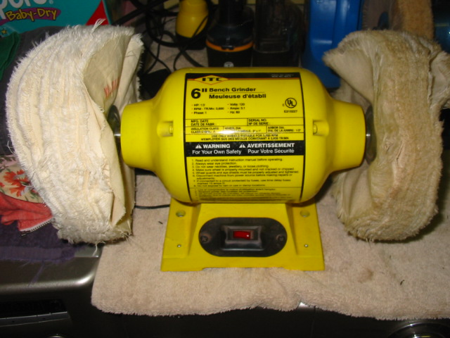 The yellow buffer above is my secondary or polishing buffer. The wheels are not as worn as the ones on the blue grinder because I use them less frequently in the process of buffing. It is used for the final polishing. The left side is a clean flannel wheel with no product on it. It still loses strings when I buff with it. It is soft and gives the carnauba a real shine. The right side is the carnauba wheel. It too is charged with wax and ready to use. I am careful how much wax I load the wheels with as too much can really make a mess.