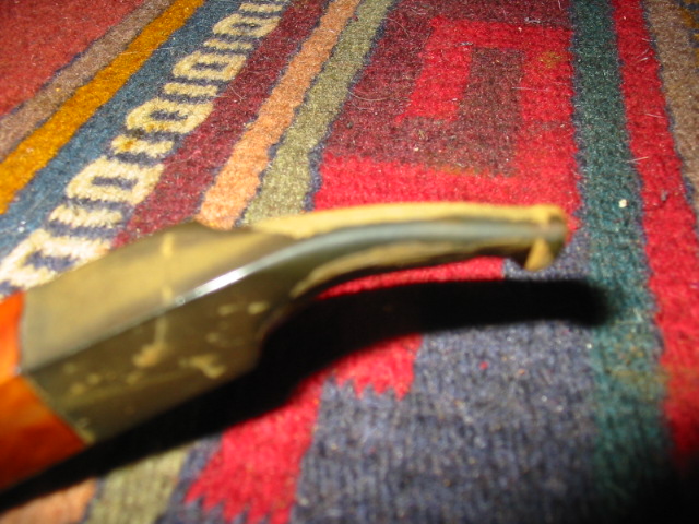 I used needle files to begin to reshape the stem and the button. There was a lot of material to remove to even out the slope of the stem to the button. I also needed to reshape the button to make it truly a button. The slot needed to be cut in the button as well as there was only the end of the airway and it was very close to the top of the button. The next series of four photos show the work of the needle file in reshaping the stem. The groove on the top of the stem is shown in the first photo and you can see that it was not too deep. The angle of the blade to the saddle however was very steep and the stem was thick. While the groove is gone there still was a lot of work to do in reshaping the angles of the stem. In the second photo you can see the work done on the underside of the stem. This groove was very deep and there was a lot of work to do to smooth the surface to remove the groove and reshape the angles on the blade of the stem. All the work done at this point was done with flat blade needle files to smooth the grooves, flatten the stem and shape the button. The third and fourth photos in the series show the stem in profile so that you can see the button begin to take shape and the grooves begin to be blended into the surface of the stem blade.