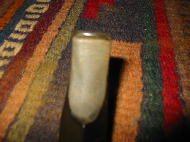 I decided at this point to use my Dremel with the sanding drum to thin the stem down and to work out the groove on the underside of the stem. The next series of five photos show the stem after the sanding with the Dremel. I was careful to not cut too deeply in the top of the stem as the airway seemed very close to the surface of the stem. I thinned the upper portion of the stem just before the saddle. I wanted the slope from the saddle to the button to be gentler and to make the bit thinner. The first two photos show the stem after sanding the top of the stem with the Dremel. The third photo shows the underside of the stem where I sanded to thin the stem and to remove the groove. At this point the groove is just a simple line that is cut in the stem. The groove is gone. The rest I decided to remove with sandpaper and hand sanding. The last two photos in the series show the stem in profile to give an idea of the slope from the saddle to the button and how the shape is beginning to develop. There was still much sanding to do.