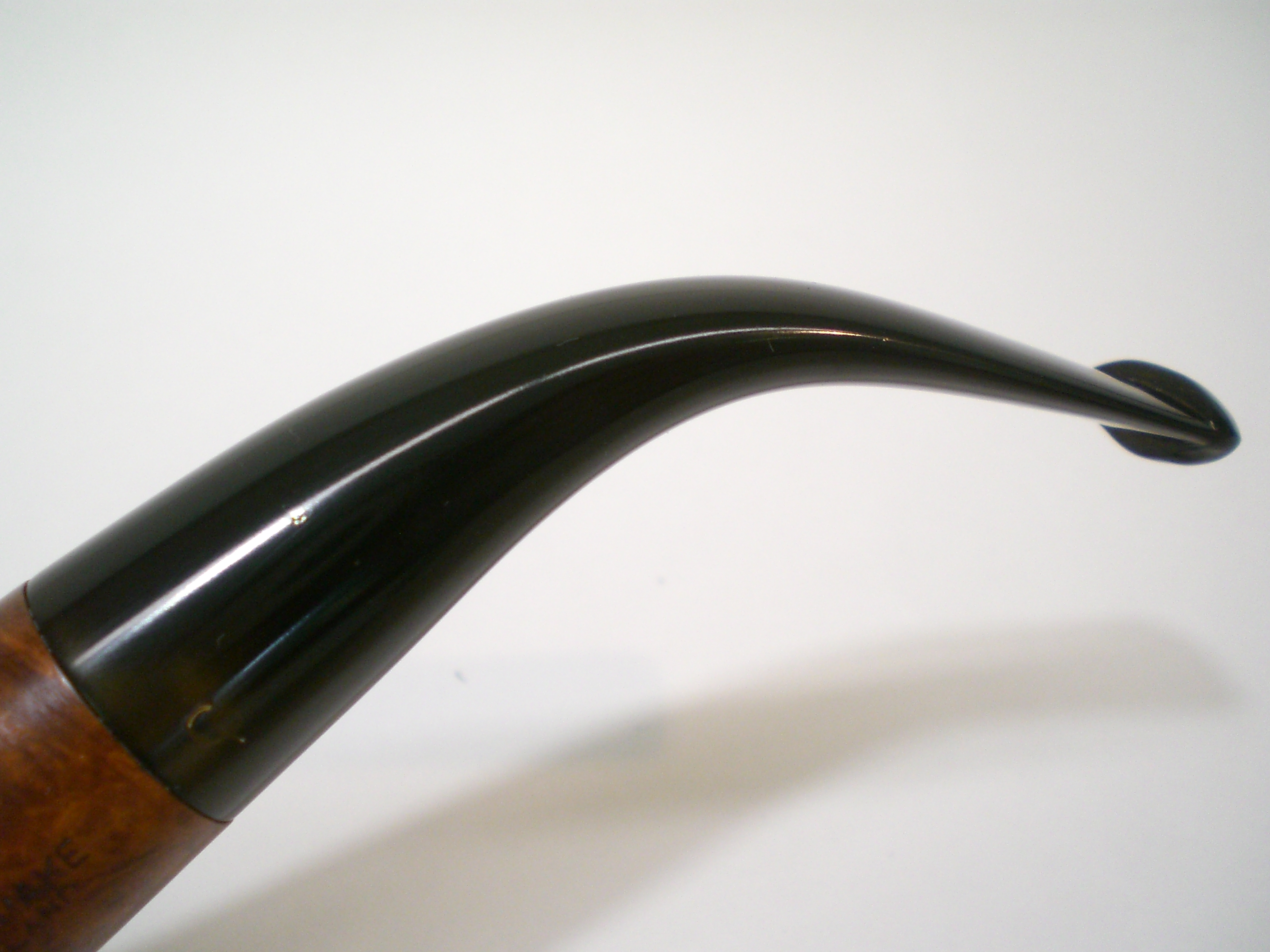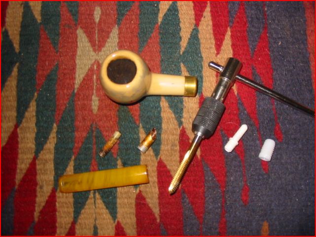 I decided to replace the original tenon with a Delrin pushpull tenon. That sound like an easy swap but it was not that simple. The tenon that was in the pipe was very small and the threads were fine. The new Delrin tenon was ¼ inch in diameter and was a good open draw. I drilled the amber very carefully with 3/16 inch drill bit to remove the threads and then a ¼ inch drill bit to open it up. I used a cordless drill that I adjusted to a slow speed and gently opened up the amber to ¼ inch. I took it back to the work table and used a tap to thread the newly drilled opening. Once that was clean and open I screwed in the new tenon and the stem was good to go. I cleaned up the tenon and stem junction and sanded it smooth so that the fit was smooth and transitionless.