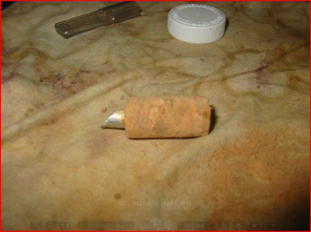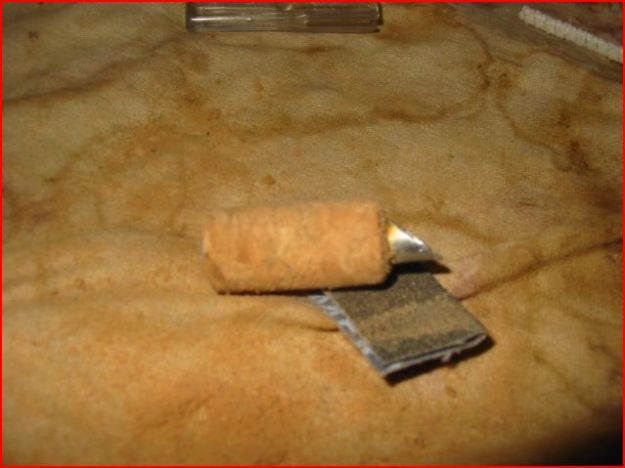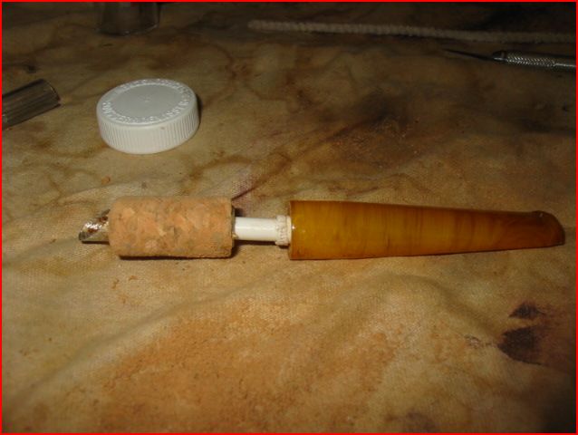 I screwed in the Delrin mortis portion of the push pull tenon on one end of the cork and threaded in the metal tip in the other end. I then took my Dremel to the cork to reduce the size of the cork. I removed the outside of the cork with the sanding drum until it was as close as I could get with the Dremel. I then sanded the cork with a folded piece of emery cloth until it was almost perfect. I unscrewed the metal tip and measured the depth of the shank so that the cork plus the tip would end up with the tip just below the air hole in the bottom of the bowl. I cut the cork with an art knife that was sharp until it was the correct length. Then I used my sanding board to level the cork so that when the metal tip was in it would sit smoothly. It took a bit of sanding but once it was done I reinserted the metal tip.