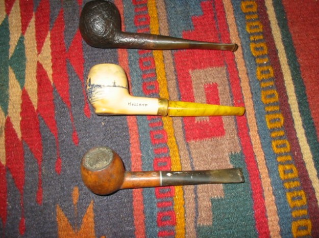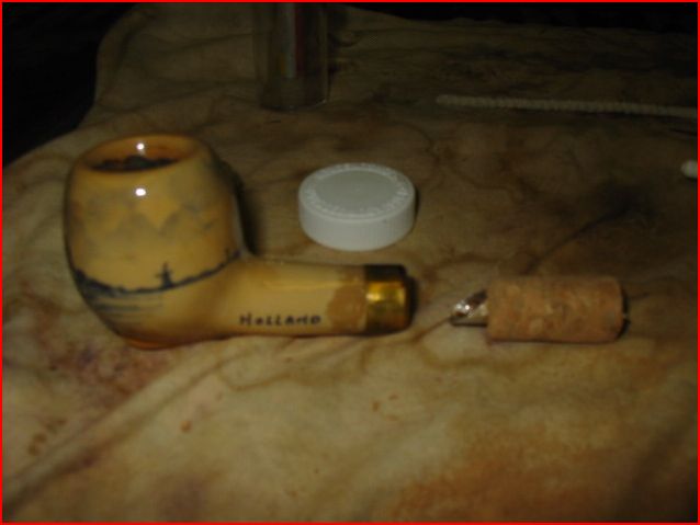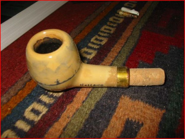 I picked this old ceramic double-walled pipe up at an antique shop. The thing that attracted me to it was the amber stem. Or at least it appeared to be amber. The stem was taped to the shank with scotch tape and the bowl was badly caked with thick tars and carbon. The outside of the bowl was spotty with grime and grease. There were fingerprints all over the grime. The stem was blackened on the inside and showed stain through the airway and button. The bowl was cream coloured porcelain under the grime and had a Delft blue Dutch windmill on the front and smaller ones on the horizon around the bowl. The bottom edge of the bowl and part way up the sides was had blue lines and shadows drawn in to look like a canal with the windmills on the other side of the water. Behind and above the windmills clouds and sky had been stylized into the scene. The entirety had been glazed with a clear glaze over the pipe. With a little work this might very well turn out to be a beautiful pipe.