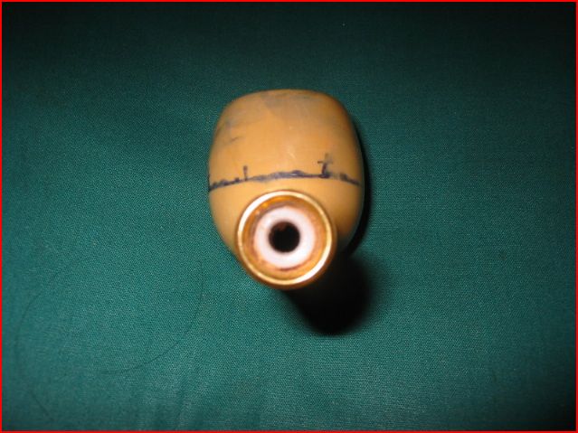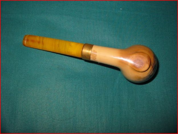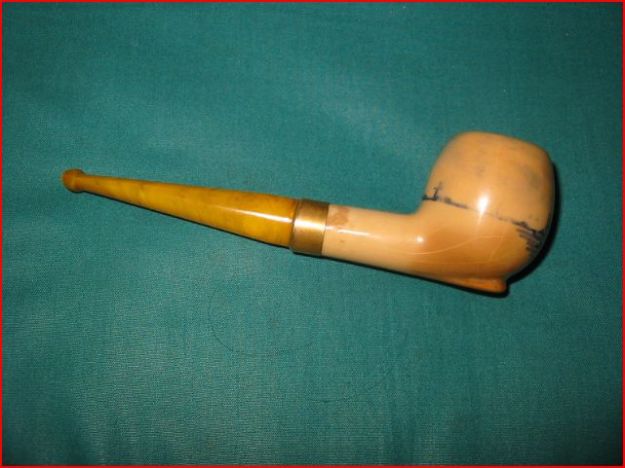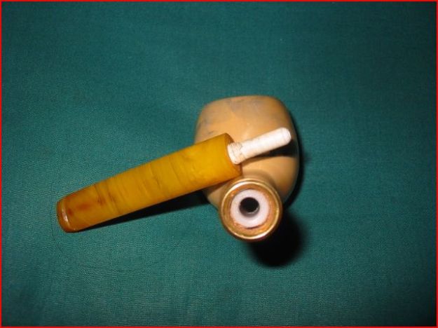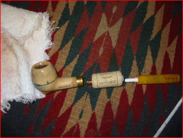 When I brought it home to work on it there was quite a bit to do to clean it up. I removed the scotch tape from the stem and shank and the stem dropped out of the shank on the work table. It had a metal screw tenon that was clogged and badly bent. I was able to remove the screw tenon from the stem with a pair of needle nose pliers. It was threaded into the stem so with a little effort I was able to unscrew it. The stem was indeed amber and as the screw tenon came out a small flake of amber came with it. I cleaned the airway on the stem with isopropyl alcohol, pipe cleaners and a shank brush. I scrubbed the button and slot to remove the blackening that was built up on it. I then removed the scotch tape from the shank using some acetone to soften the glue. It came off easily. The gold coloured band is stamped GoedeWaagen Made in Holland. I cleaned the band and polished it. I used a dental pick to remove the broken cork that was inside the shank. It was glued it and it was brittle. It came away with a bit of work. I used cotton swabs to clean out the shank. In the bottom of the shank was a metal piece that originally had been on the end of the cork insert and slid below the inner bowl of the double-walled pipe. I scrubbed the bowl with hot water and repeatedly ran water through it to loosen the buildup of tars inside between the walls. I scrubbed the outside of the bowl while I was washing it and was able to remove all of the grim. The remaining patina and coloration of the bowl is similar to a meer.