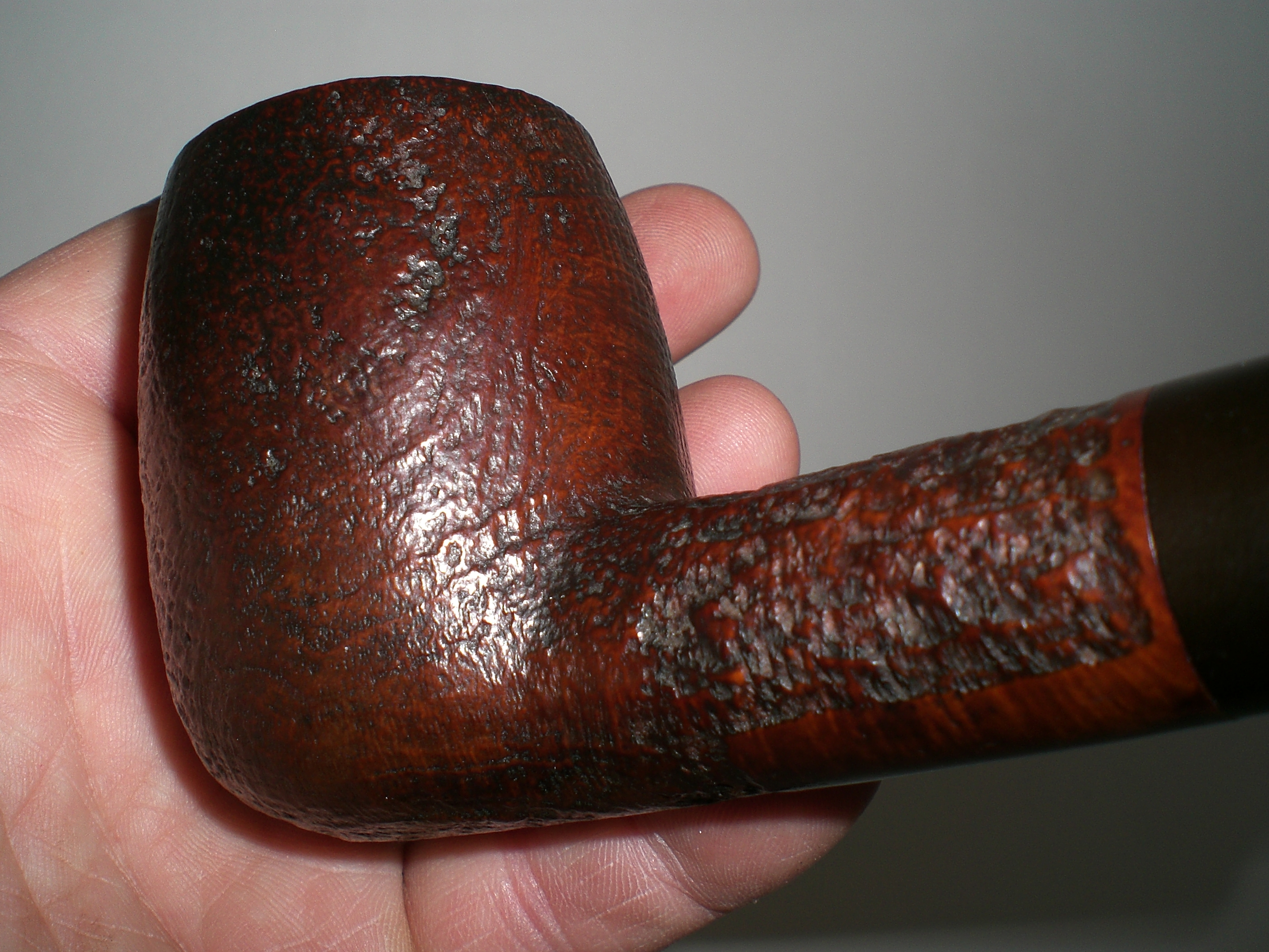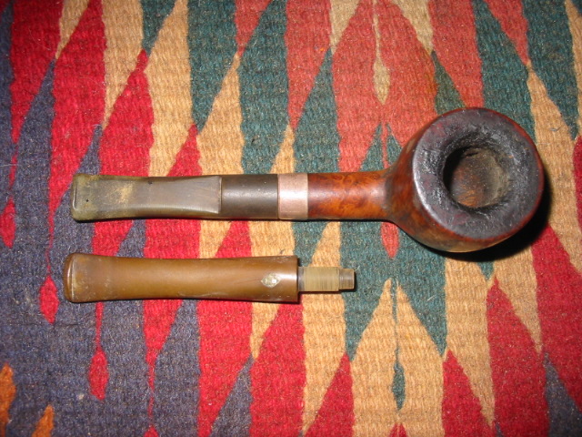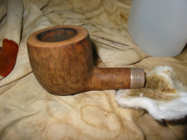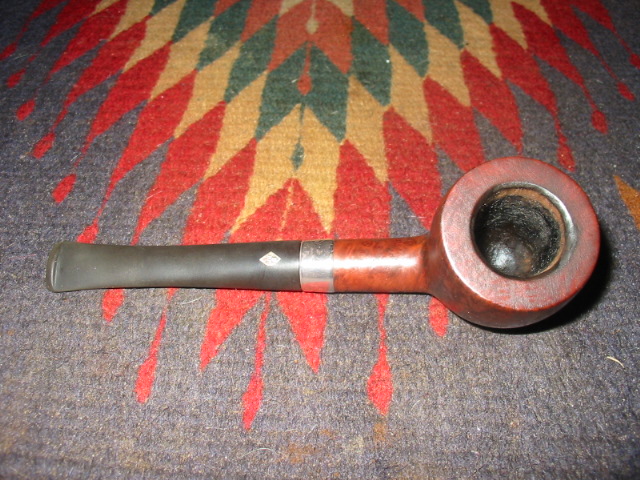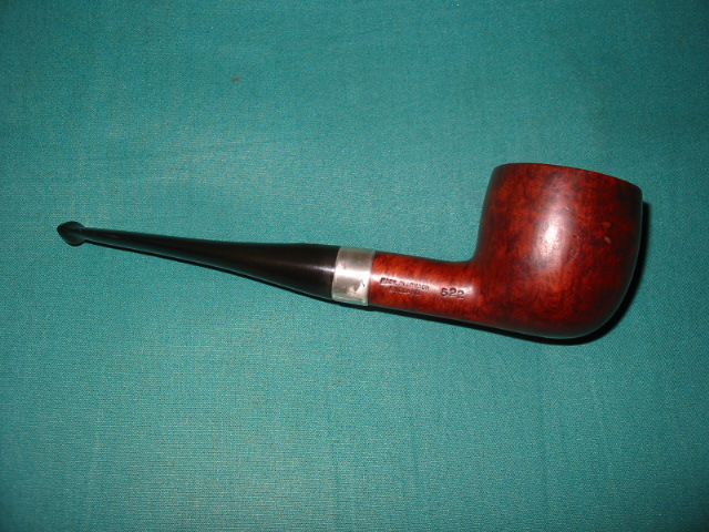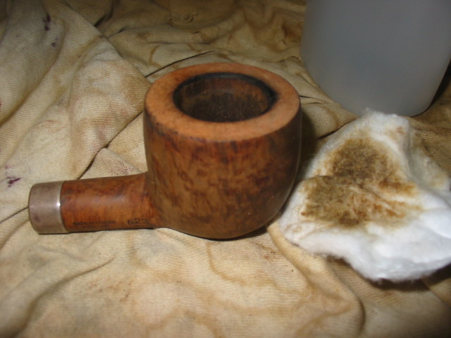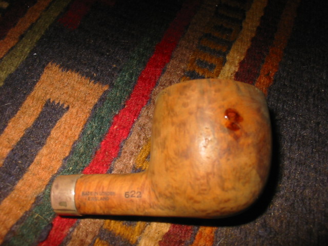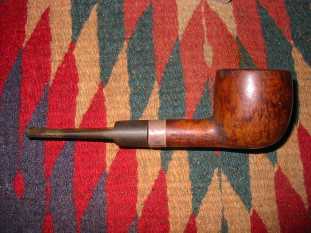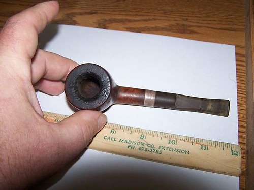 Once it arrived I took time to look it over. The bowl indeed had some great looking grain under the grime. The rim was covered with a thick coat of tar and carbon. The bowl looked to be unmarked by reaming and was still round. The cake on the inside was crumbly and sticky. The entire shank was caked with the sticky grime as was the stem. Definitely a goopy aromatic had been smoked in this old timer. The sterling silver BBB band had dents in it but was unbroken and uncracked. It was definitely an original band as when the stem was removed the shank was not cracked or damaged. The stem was indeed a replacement. It was a standard blank that still had some of the edge marks from the casting on it. It also short in terms of the length of the original pipe as I have found it on pictures on the web and in the catalogues. I was unable to find the 622 with a saddle stem like this one. It did not have the BBB diamond logo or a stamping of BBB on the stem either.