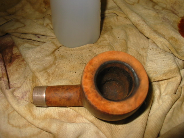 I put the bowl into the alcohol bath for about a half hour while I worked on removing the oxidation from the stem. I placed the stem in a bath of Oxyclean and hot water to soak when I took the bowl out of the alcohol bath. The Oxyclean softens the oxidation and makes it easier to work with than the hard unsoftened oxidation. The bowl was a real mess and I wanted to get the grime and remnants of the old finish removed so I could start fresh with the bowl and restain it. When I took the bowl out of the bath it looked like is shown in next three pictures. The finish was gone but for a few grey spots at the bowl shank junction and around the rim. The top of the bowl was seriously covered with goopy tars and black sludge that would take some work to remove. You notice in the first picture that on the right side of the bowl near the front were two fills that needed to be addressed as the putty had shrunken and they were divots.