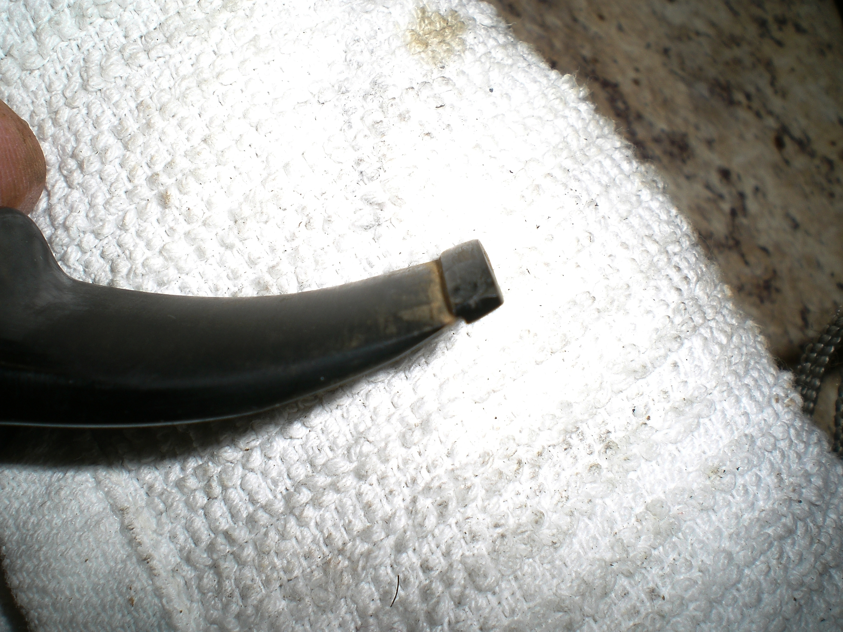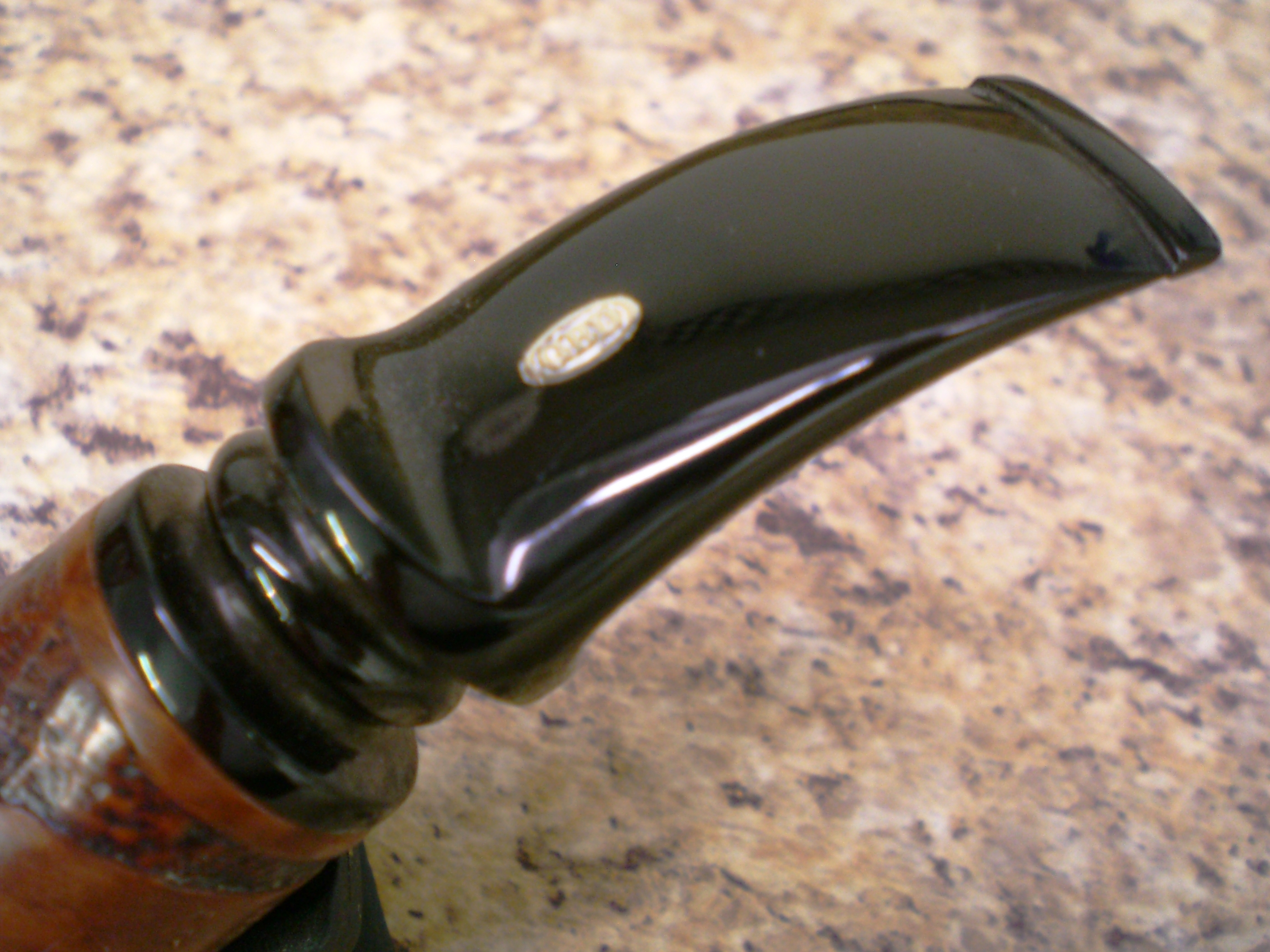 When the pipe arrived, the briar looked in great shape but the damage loomed large. In the ad, the seller offers that he could do the repair for an additional $15. I was skeptical, but curious as to how he might accomplish this feat. The seller replied that Walker Briarworks did his repair work. I did contacted Dave Wolfe at Walker and was not surprised to learn a $15 repair was not an option. Unfortunately, neither was getting a new stem made and transferring the brass rondell. Dave told me that vulcanite stock in that diameter (22 mm) was no longer available.