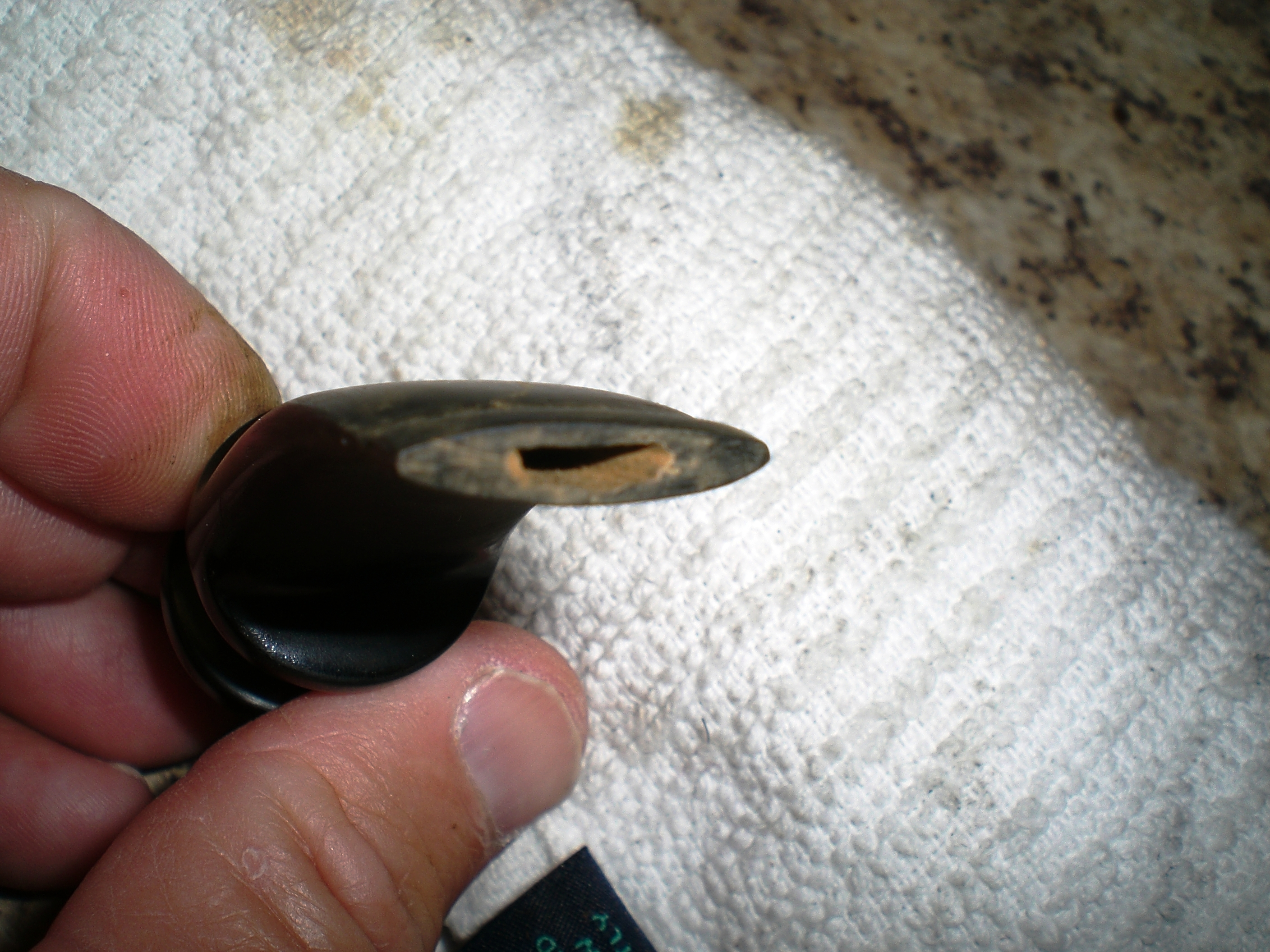 Using a small, flat blade needle file, I made a cut on both sides of the stem for the crease. Than, using a heavier metal file I carefully carved out a new button. I went back to the flat needle file to remove some of the heavier file marks. I used both files to shape the button into a “football” shape. additional flat, tapered shape needle files were used to open up the stem hole.