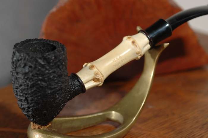 When I first saw this Medici Bamboo Acorn pipe I knew that I had to have it. The Medici mark is made by or for Todd Johnson of Todd Johnson pipes. I bought this one and later found out via Adam Davidson that it was carved by him when he worked with Todd. I bought it from a fellow Smoker’s Forums in late 2006 or early 2007. And I have been smoking it since that time and it is a great smoke. Since I had the day off today I decided to write a review on this beauty. The length of the pipe is 6 inches long and the bowl height is 2 inches. The chamber diameter is 3/4 inches and depth is 1 1/2 inches. It is great sized pipe and very light weight. It is comfortable in the hand. The overall shape is something like a ¼ bent acorn with a nicely done bamboo shank extension. The stamping is on the bamboo shank. It is stamped USA over MEDICI over 2006.