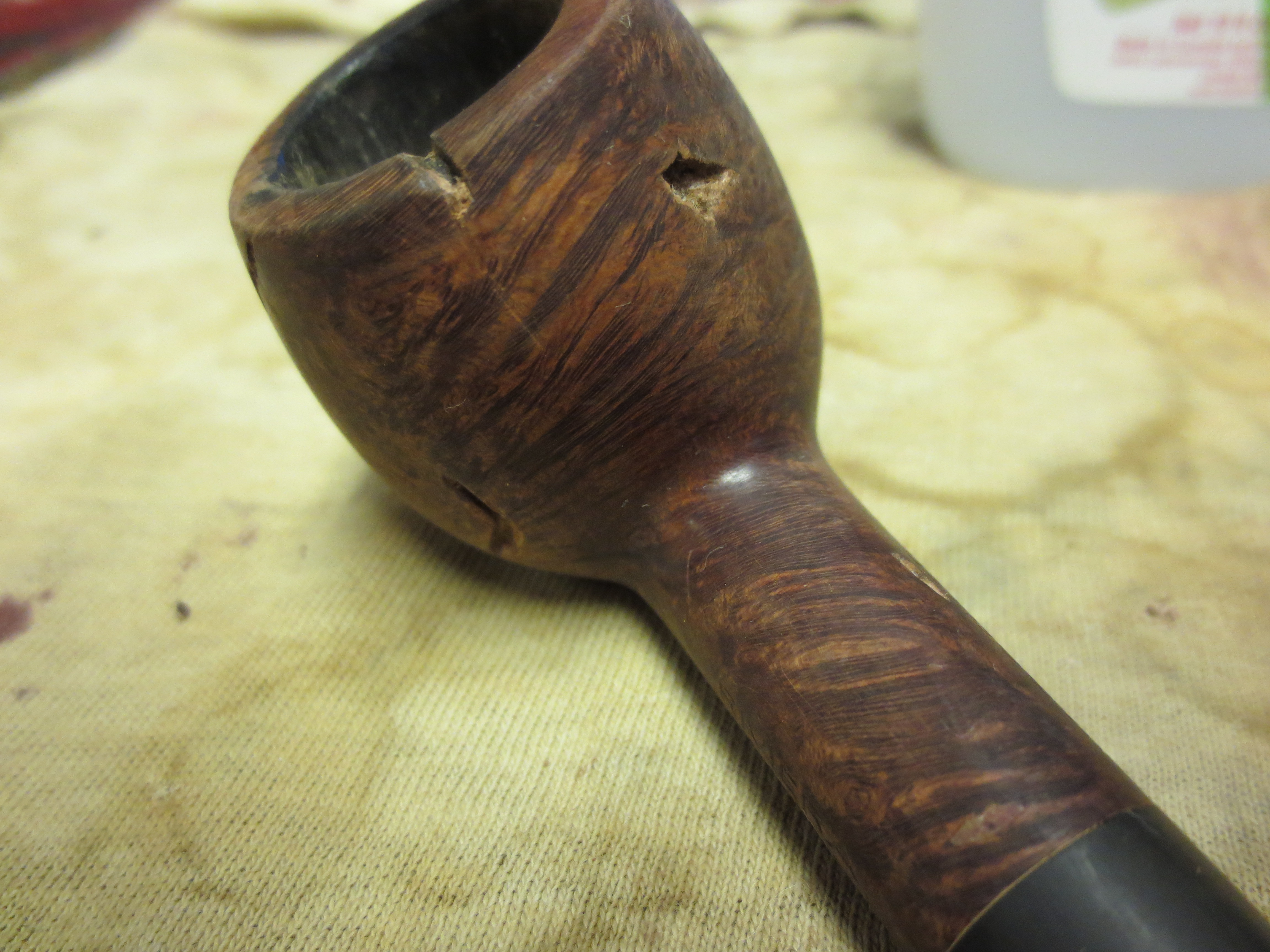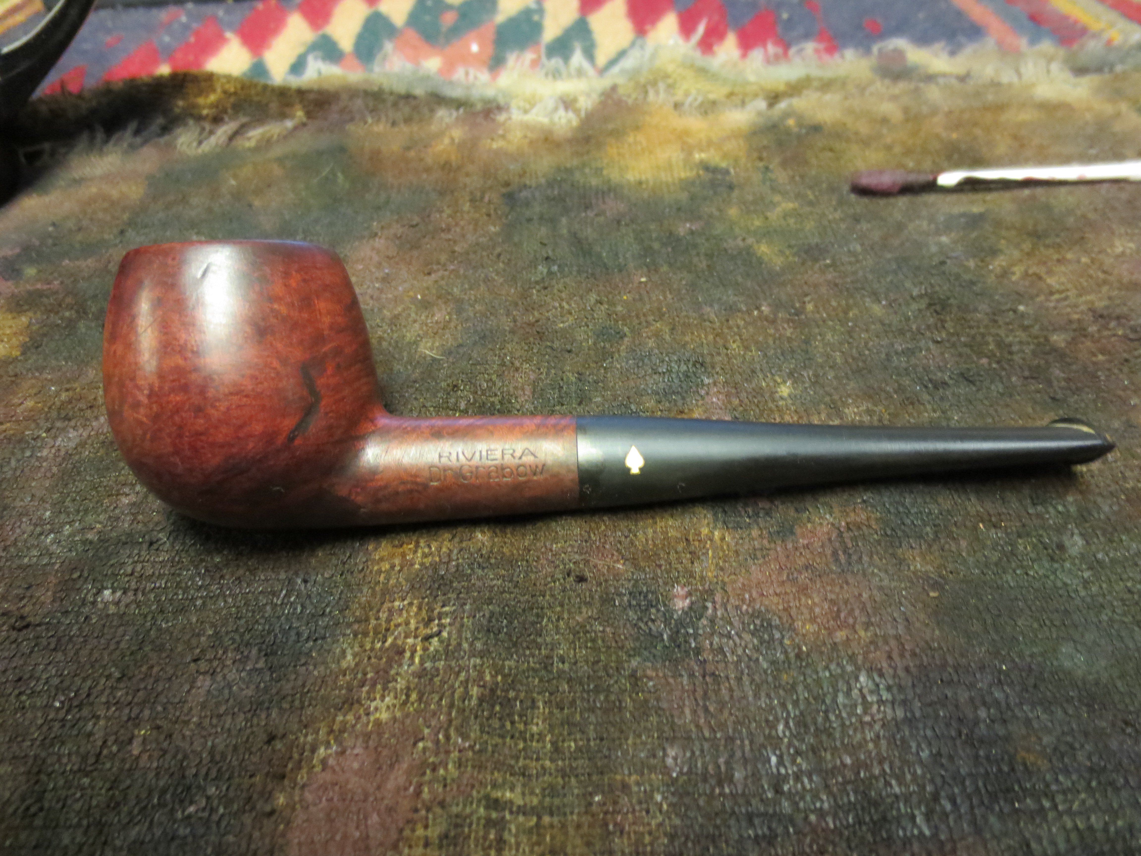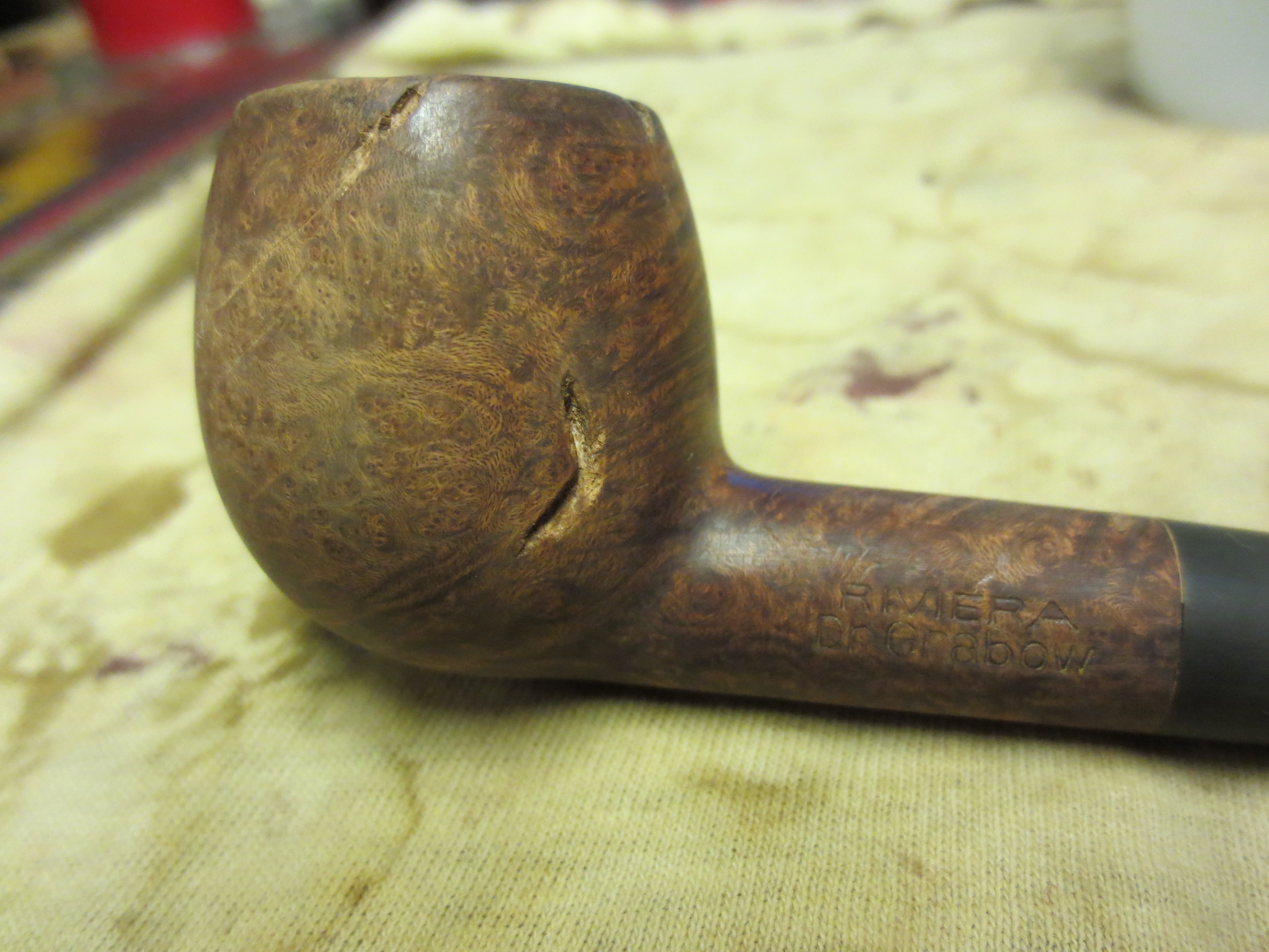 I am finally down to the last five pipes in my refurbishing box. I have a bunch more on their way here but I would like to finish up this lot before they arrive as they have been sitting here for a long time always getting passed over and laid aside for more favorable looking options. Last evening I decided to rework this old Dr. Grabow Riviera. It was a pleasant shape but an ugly piece of briar. I removed the stem and was amazed that it was a push stem with a well made tenon. The drilling was spot on and the internals were really well done. The draught on the pipe was excellent. The bowl was clean and the drilling in the bowl was nicely done as well with the airway perfectly centered on the back bottom edge of the bowl. The externals however left much to be desired. The first series of four pictures below show the bowl with the many fills that are on the outside of the bowl. These were not tiny fills by any means; in fact the majority of them are quite large. I had to make a decision on whether to refill them or to rusticate the pipe. Last evening I just was not in the mood to rusticate the pipe. Sometimes I just feel like working over a bowl but this was not the night for doing that. So I decided to pick out the fills and rework them with briar dust and superglue and restain the pipe. The stem was in pretty decent shape also – no bite marks or tooth chatter, very clean with a minimum of oxidation.