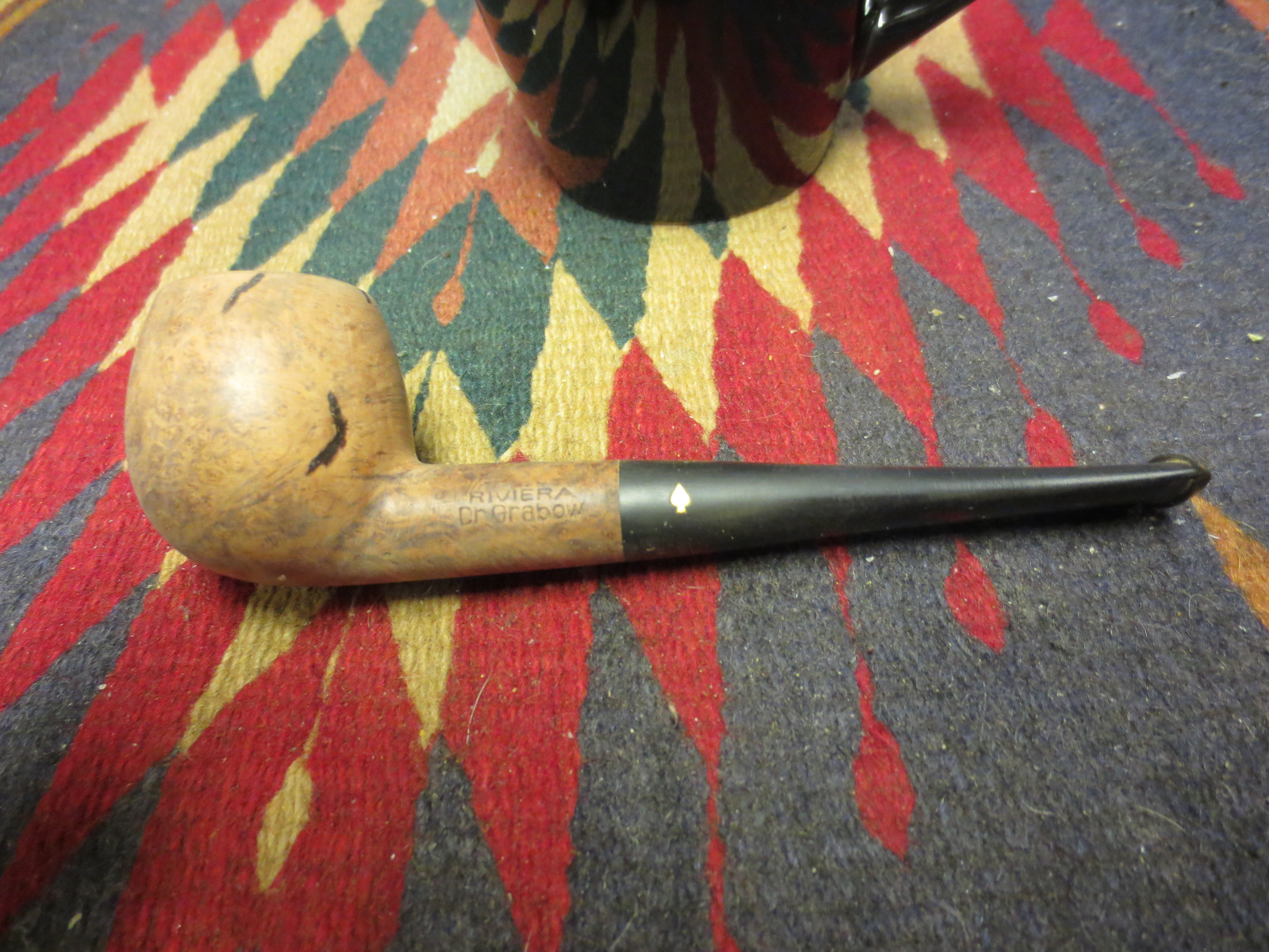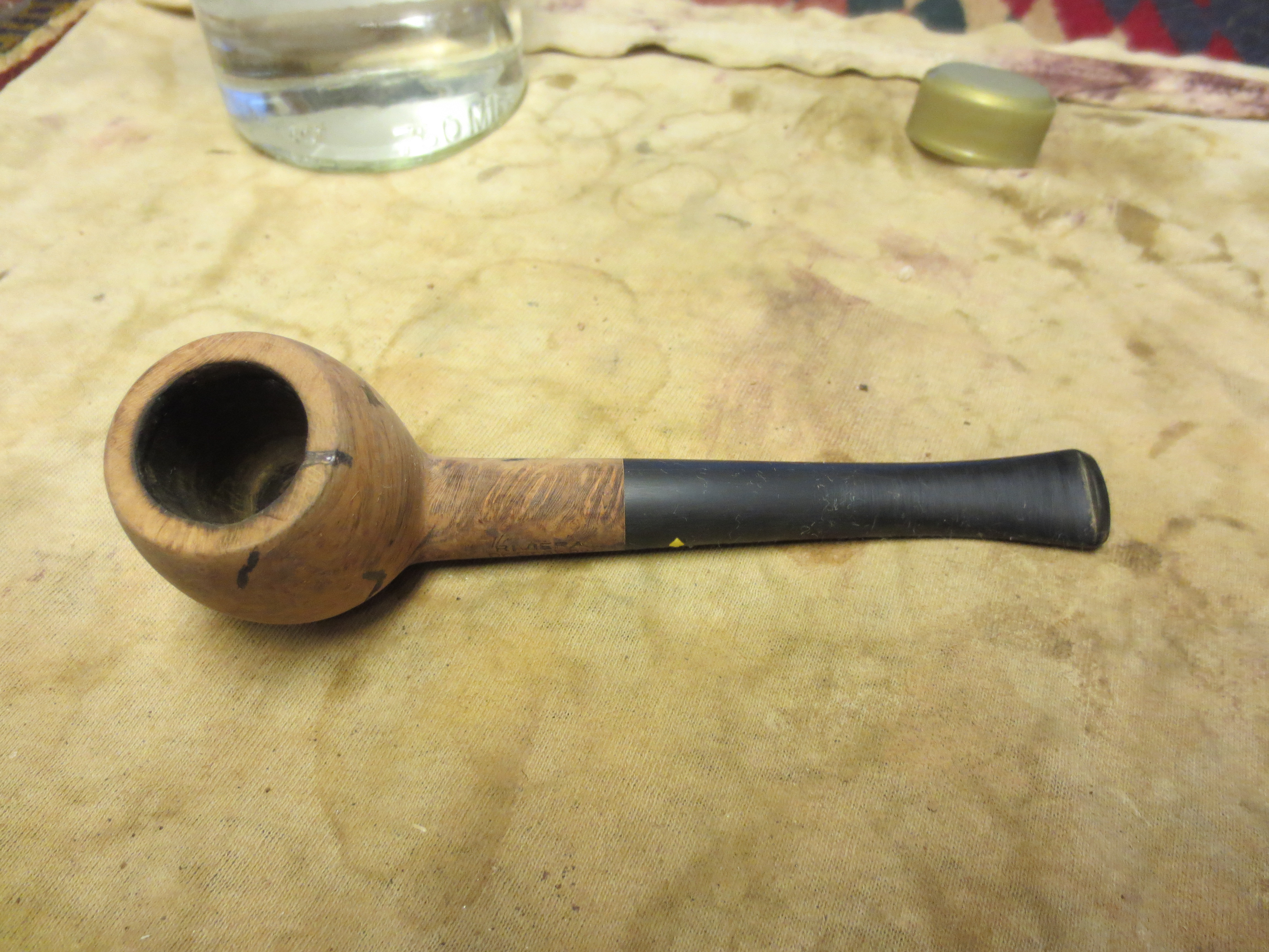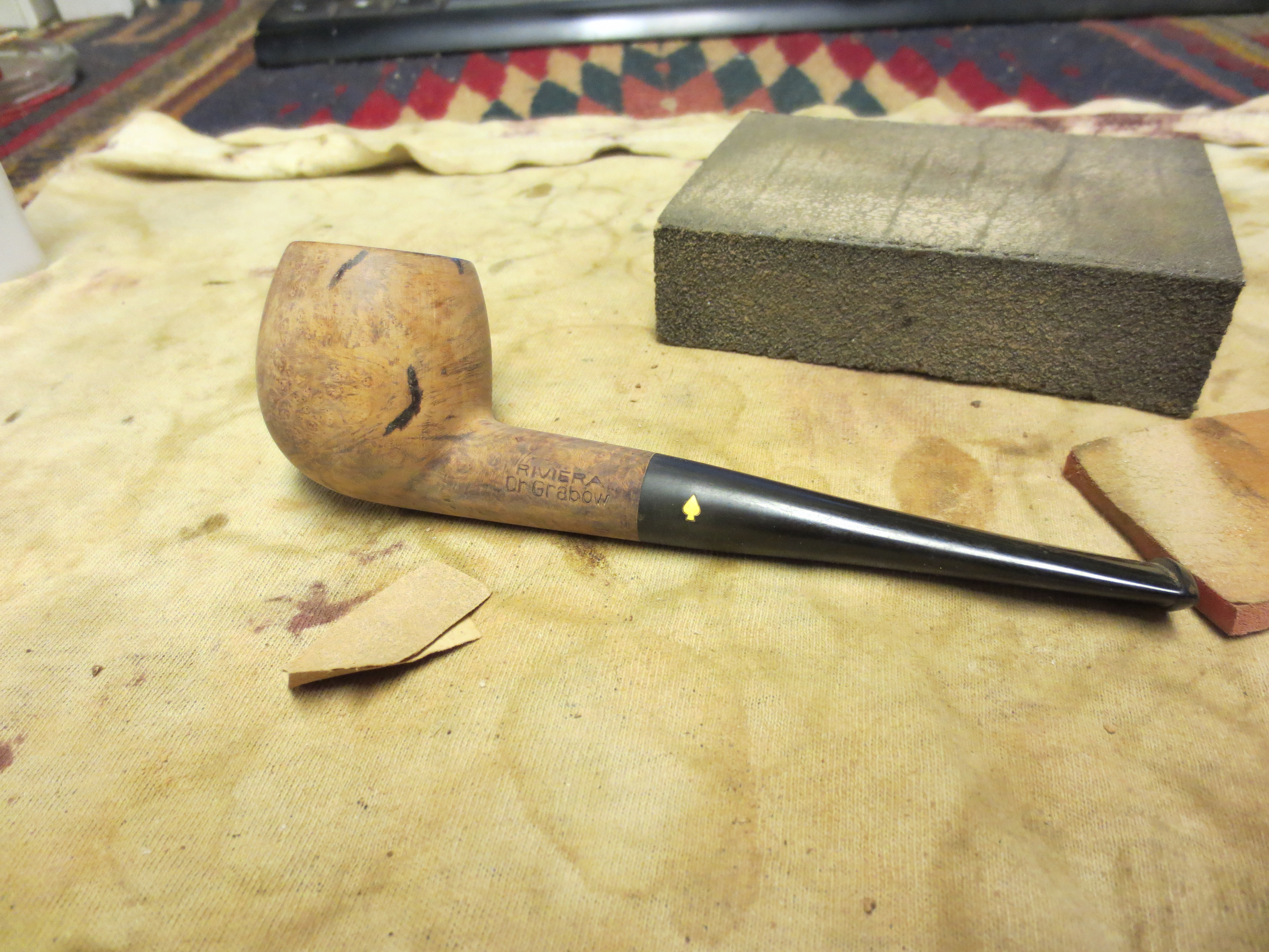 I am finally down to the last five pipes in my refurbishing box. I have a bunch more on their way here but I would like to finish up this lot before they arrive as they have been sitting here for a long time always getting passed over and laid aside for more favorable looking options. Last evening I decided to rework this old Dr. Grabow Riviera. It was a pleasant shape but an ugly piece of briar. I removed the stem and was amazed that it was a push stem with a well made tenon. The drilling was spot on and the internals were really well done. The draught on the pipe was excellent. The bowl was clean and the drilling in the bowl was nicely done as well with the airway perfectly centered on the back bottom edge of the bowl. The externals however left much to be desired. The first series of four pictures below show the bowl with the many fills that are on the outside of the bowl. These were not tiny fills by any means; in fact the majority of them are quite large. I had to make a decision on whether to refill them or to rusticate the pipe. Last evening I just was not in the mood to rusticate the pipe. Sometimes I just feel like working over a bowl but this was not the night for doing that. So I decided to pick out the fills and rework them with briar dust and superglue and restain the pipe. The stem was in pretty decent shape also – no bite marks or tooth chatter, very clean with a minimum of oxidation.