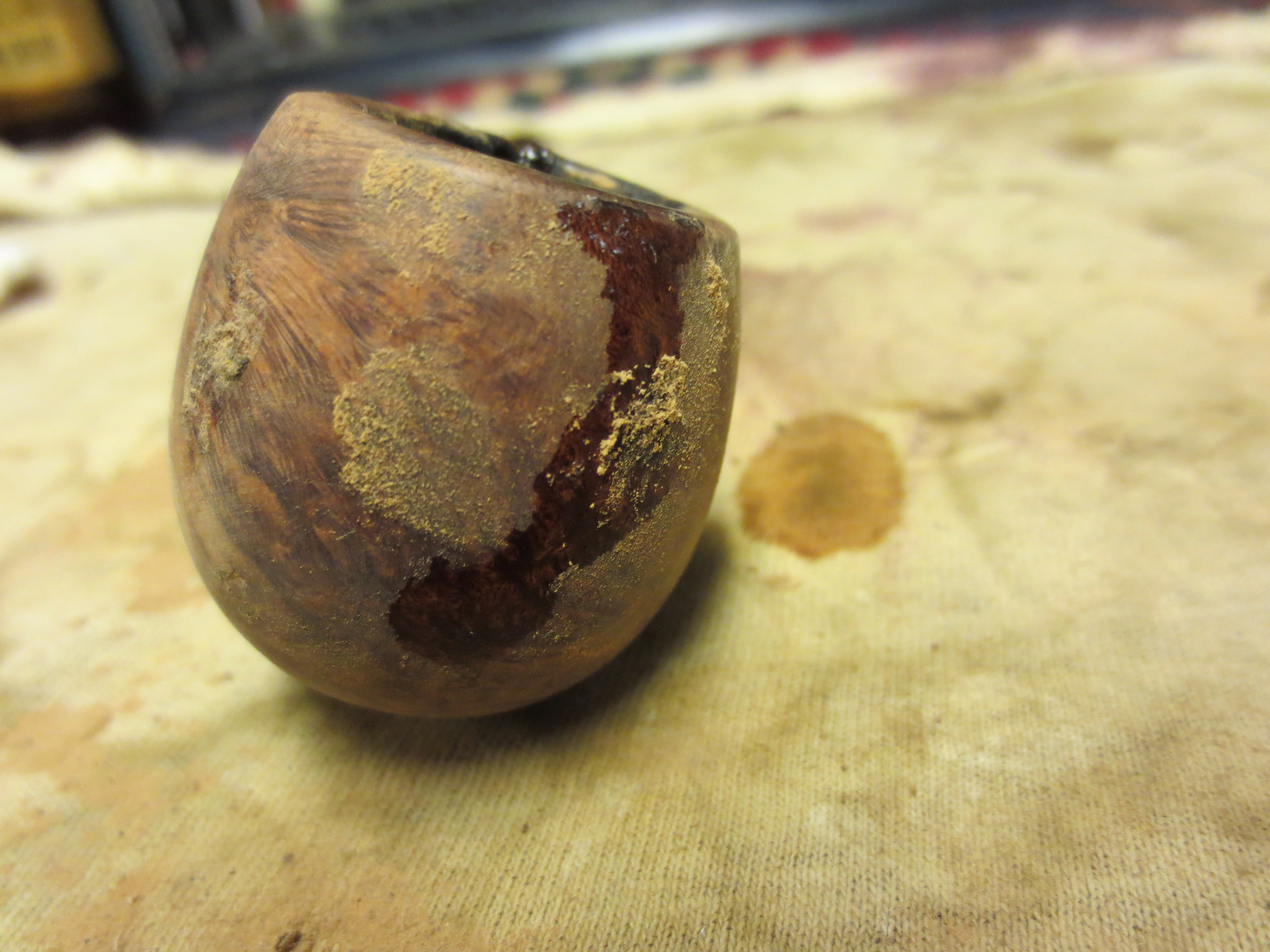 The next series of thirteen photos show the progress of sanding the patches back to the surface of the bowl. In this case I was planning on refinishing the bowl anyway so I sanded the whole bowl back to bare briar. I began by sanding the patches with 240 grit sandpaper and then 320 grit sandpaper. Once the overfill of briar dust and glue was sanded fairly smooth I sanded itwith a medium grit sanding sponge and then a fine grit sanding sponge. I wanted to get rid of the excess fill and also to remove all the scratches in the surface of the bowl. I wet sanded the bowl after this with 1500 and 1800 grit micromesh to ready it for staining. I wiped it down with acetone on a cotton pad. The final pictures show the pipe as it is ready for restaining. You can see that the white putty fills are now dark patches on the bowl. I find that those these dark patches still show up they are easier to blend into the stain and somehow do not seem as intrusive to my eyes as the white patches.
