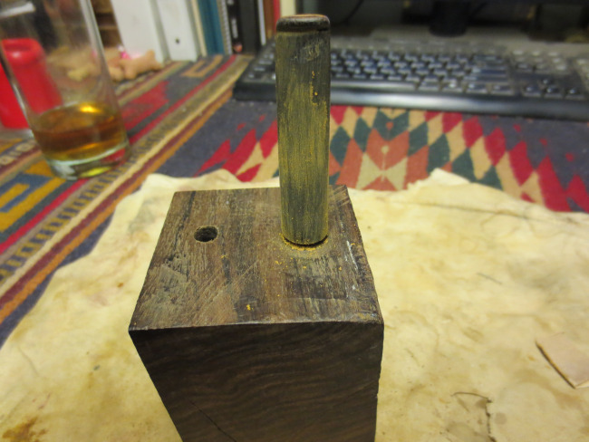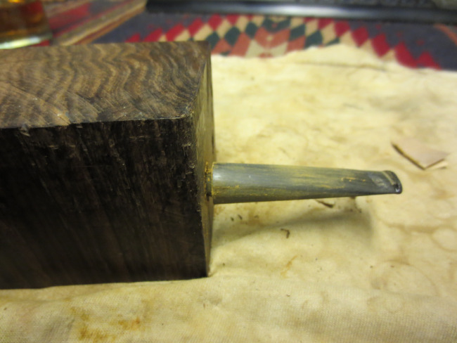 But, as always I am on the lookout and thinking of new tools or items that will make my job easier in the cleanup and refurbishing process. Some of my methods or ideas come through odd associations and a passing thought. I was looking at my drill bit keeper the other evening and noticing that the larger bit slots would work well as mortises for the tenons of the stems I was working on. My newest idea is in the design stages. But it is pretty simple. I want to cut a series of 4-5 inch lengths of 1 inch to 1 and ½ inch dowel. I want the doweling to be large enough that I can hold it in my hand while working on the stem or anchor it in a vice.I plan on drilling mortises for the standard tenon sizes into the ends (a different size on each end) of the dowel to accommodate the tenons while I work on the area of the joint of the stem and the shank. At least in theory it will give me a flat edge to push the stem against and allow me to work on the area of the stem that sits against the shank. I have not had time to hunt down some doweling yet but I have been using an ebony block that I have here to the same purpose. I drilled two mortises in the block that can accommodate two different tenon sizes. I also drilled them deep enough to allow the stem to sit flush against the block. I have used it now on two stem cleanups and it works really well. The only drawback that I find is the size of the block. I think the dowel will work better as I can hold it easily in my hand while I am working on the stem.I have included a few pictures of the block that I am currently using with two different styles and sizes of stems. Both stems fit well and the fit gave me a flat edge to work against while sanding the area where the stem meets the shank and keep the shoulders unharmed. I will post a follow-up with photos of the doweling when I have made those.