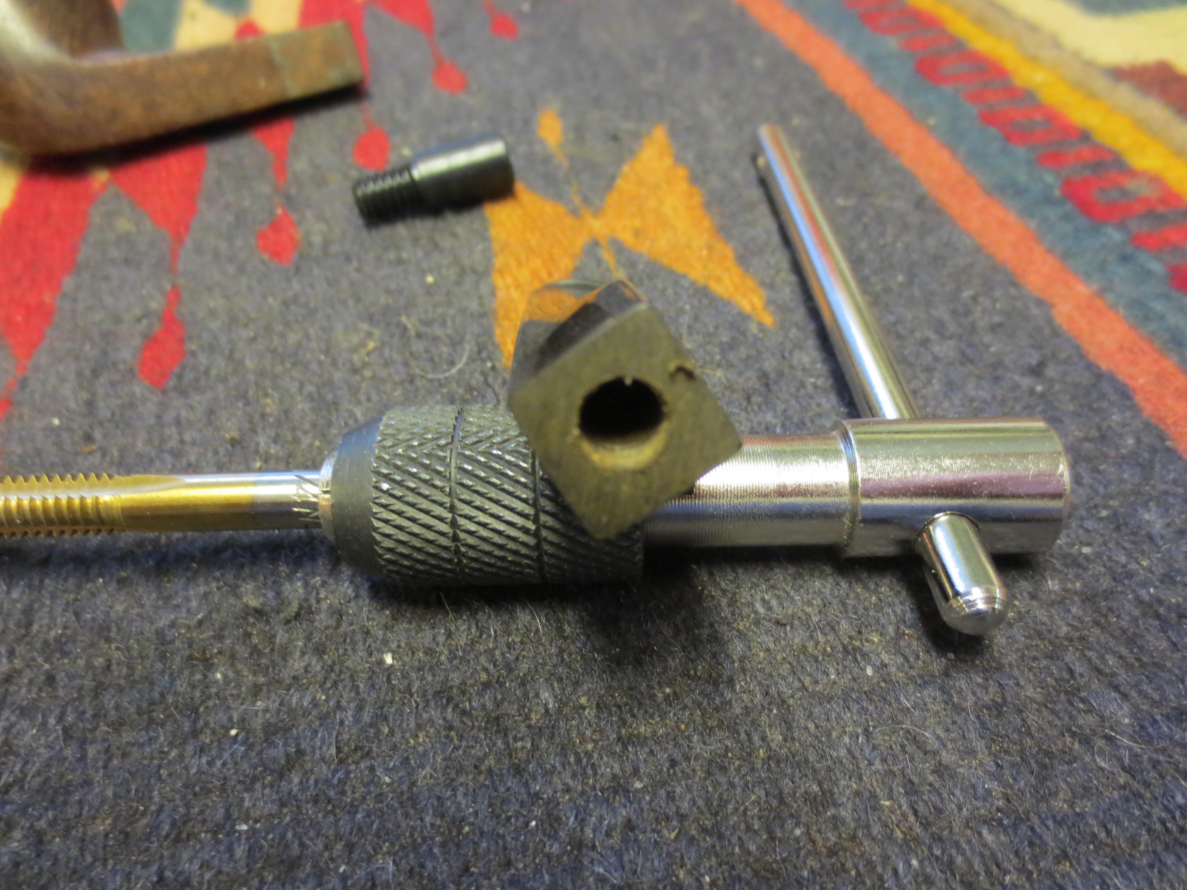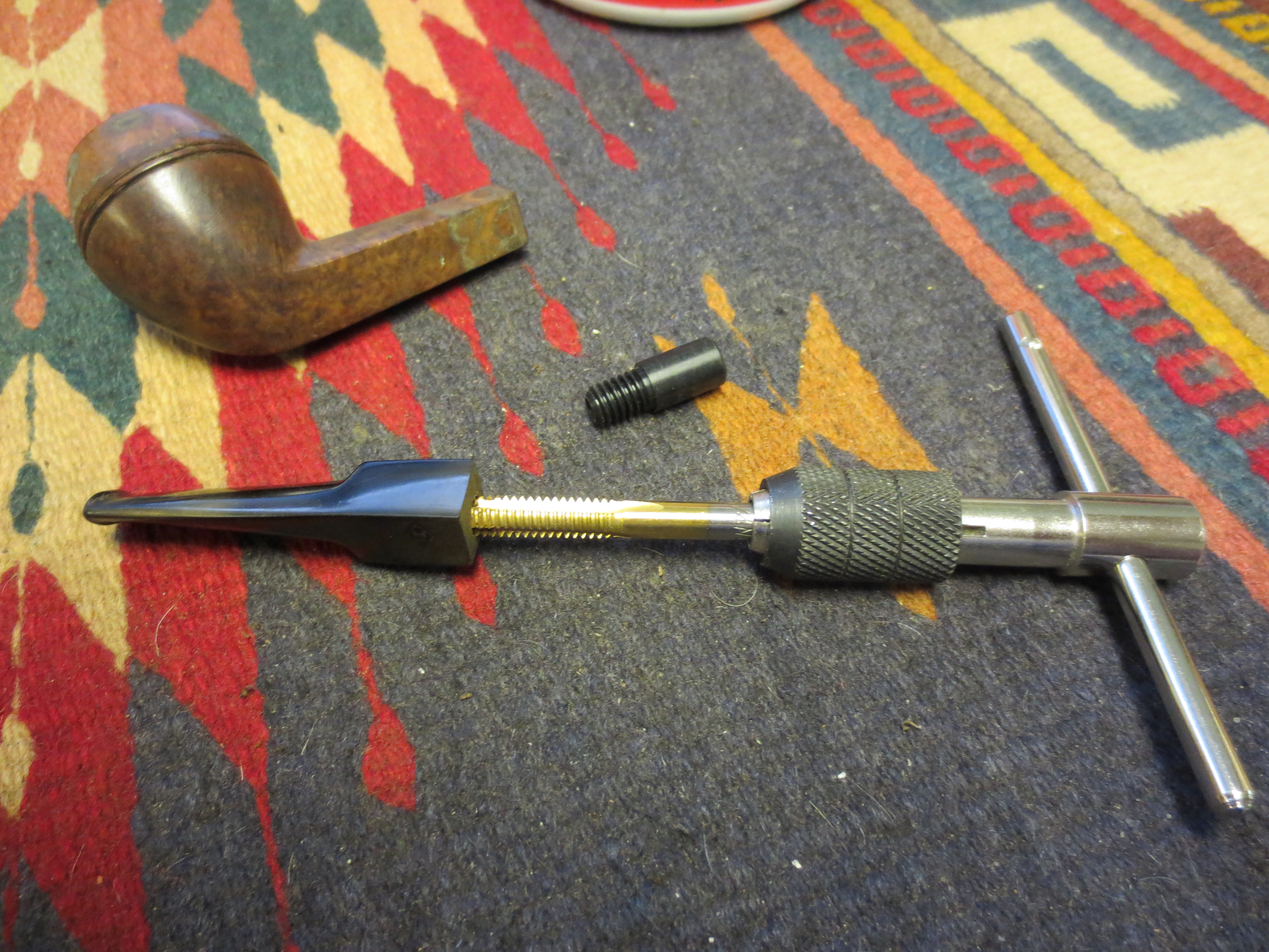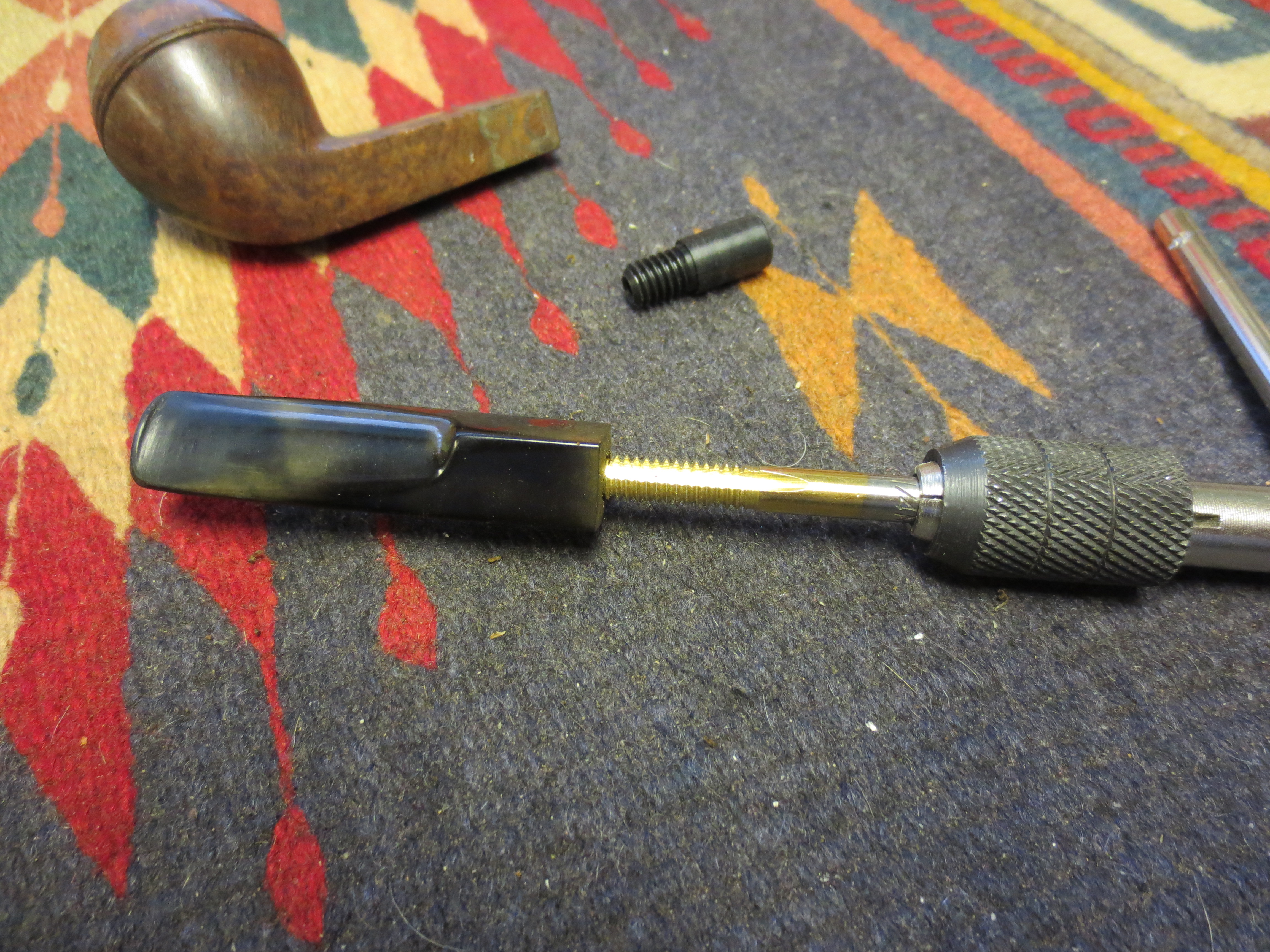 The next series of three photos shows the fitting of a new tenon. I drilled the stem and then used a tap to thread the stem so that I could screw in the new tenon. In the photos below you can see the tap in the stem and the new threaded tenon just above the bowl at the centre of the picture. The third photo shows the hole in the stem threaded and ready for the new tenon.