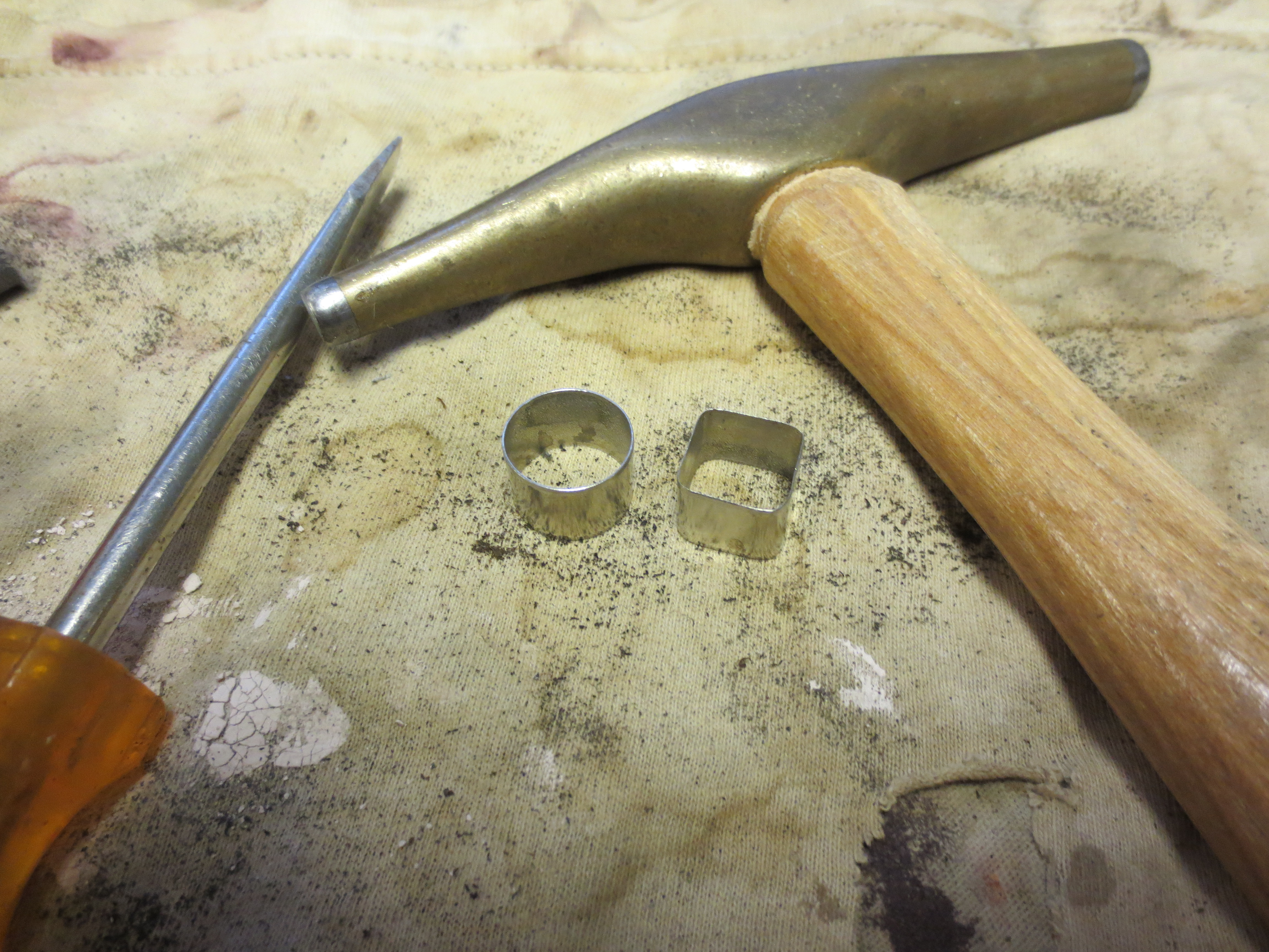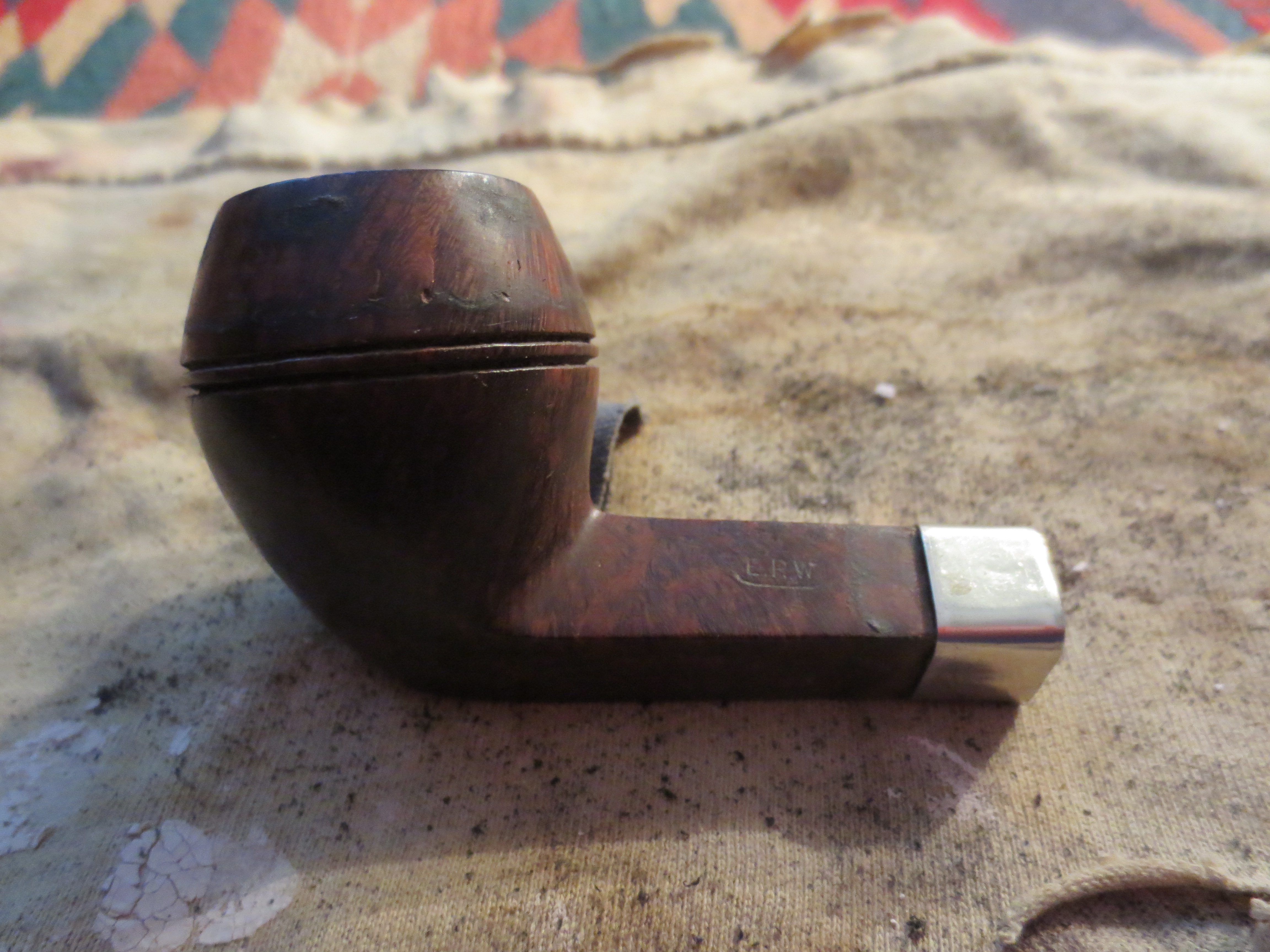 This old time long shanked bulldog was a mess when I got it. At first glance it looks pretty good. But it was not. The shank had previously been banded and that band was lost. It was a deep band and filigreed so it left marks. There were also two large cracks in the shank that extended about an inch into the length. The rim was clean but the top portion of the bulldog shape – above the double rings was also stained and filled with holes from the nails that had held the decorated rim cap in place. There were four holes – back, front and both sides. There were also deep gouges where the decorative border had cut into the briar. The stamping was faint and read EPW in an oval. There was no stem with this one either so it would need to have one made. The overall finish on the bowl was not too bad in that it was not dented or burned or damaged on the sides and undersides of the bowl.  I decided to try banding the shank and see what I could do about the cracks on the top right side of the shank and the lower left side of the shank. They would in all likelihood be an issue. I did not have a deep band so I tried with a narrower band (about ½ inch deep). I shaped a round band with a flat blade screwdriver and a hammer until it was the right shape to fit the shank. I heated the band and pressed it into place.