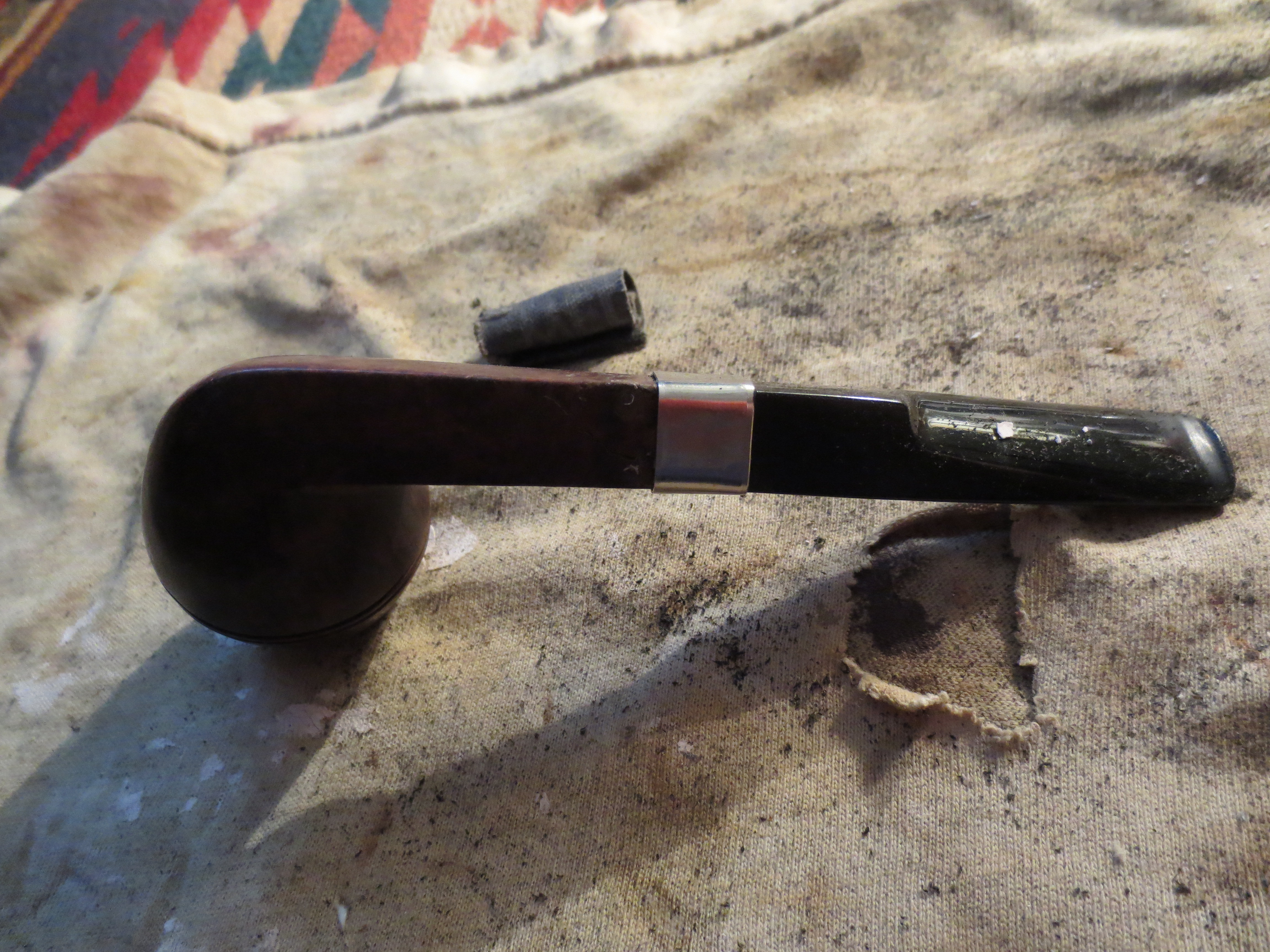 I took the two pieces back to my work table and removed the cut off piece of briar shank from the band. When they fell out they were in two pieces. I cleaned up the band and straightened out the angles to make sure it would fit the shortened shank. It was just a bit too deep and when in place would cover the W of the stamping but it would do a good job on the cracks. With the piece cut off the cracked shank had two very small cracks left that would easily be repaired by the band. I smoothed out the cut end with a piece of emery paper. In the second photo below you can see the cut off shank piece. It is cracked all the way through and in two pieces. Note also that the mortise was threaded for the older original screw tenon.