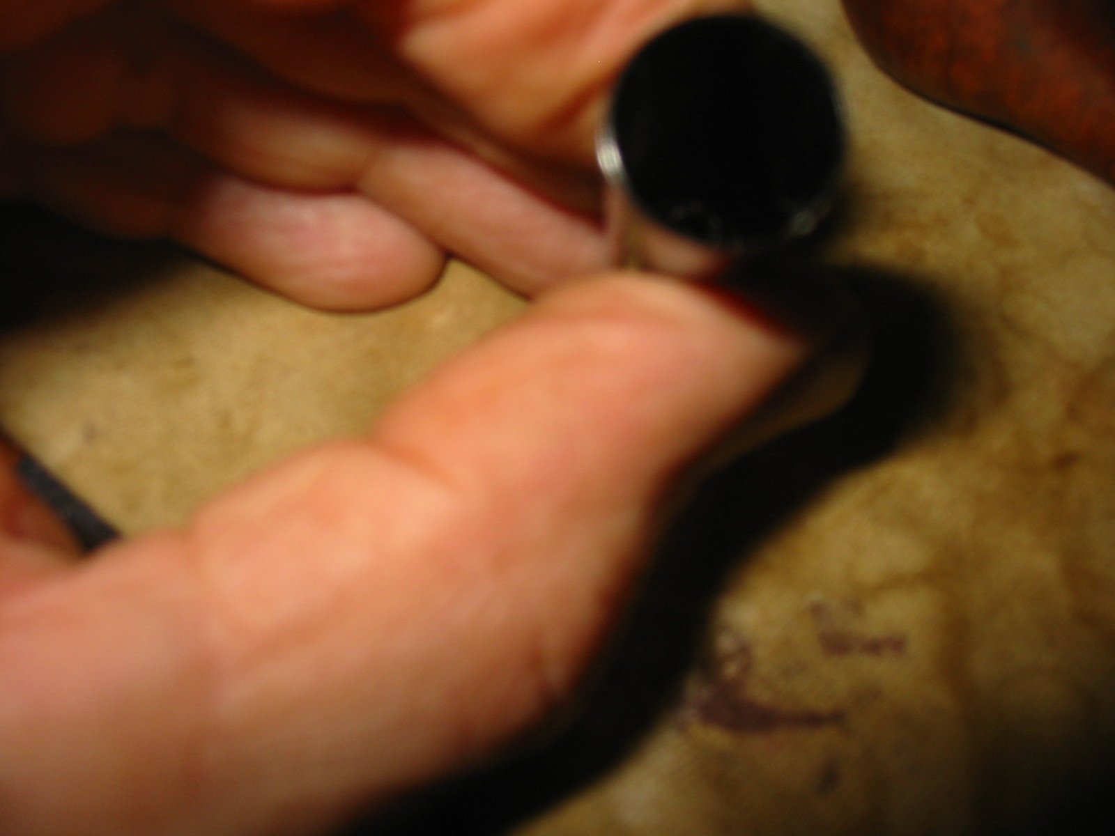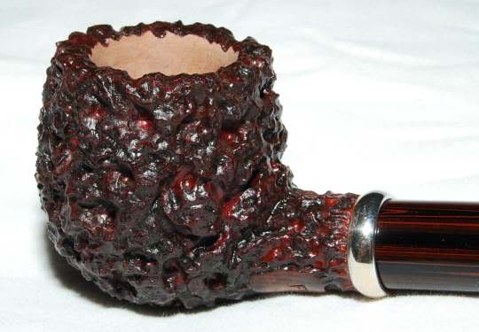 When the pipe arrived it was far more impressive than even Tony’s pictures led me to believe. I was stunned at the workmanship of the pipe and colour and feel of it in my hand. I remember just sitting at my desk after opening the package and sliding the pipe out of the sleeve that it came in and being speechless with the look and feel of this pipe. It was and is beautiful. No one even comes close to duplicating Tony’s rustication and the way in which his staining of the bowl highlights the rustication and gives it a special dimensionality that is almost uncanny. Holding his pipe in my hand is like holding a piece of lava rock with all of the nooks and crannies and colours emanating out of the crevices and holes and changing in the light that pipe is held in. The rustication is very sharp and rough in the hand but a very cool finish in terms of the feel in the hand when it heats up during smoking. The bowl is rusticated up and over the rim and ends in a craggy inner rim edge that looks great to me. The overall flow of the bowl and shank is brilliant and the colours are beautifully matched from rim to the end of the shank and on into the reds and blacks of the brindle/Cumberland stem. To separate the bowl and stem Tony handmade a sterling silver “wedding ring” band and gave it a high lustre polish. It adds a nice touch of bling to the look of the pipe and dresses it up.