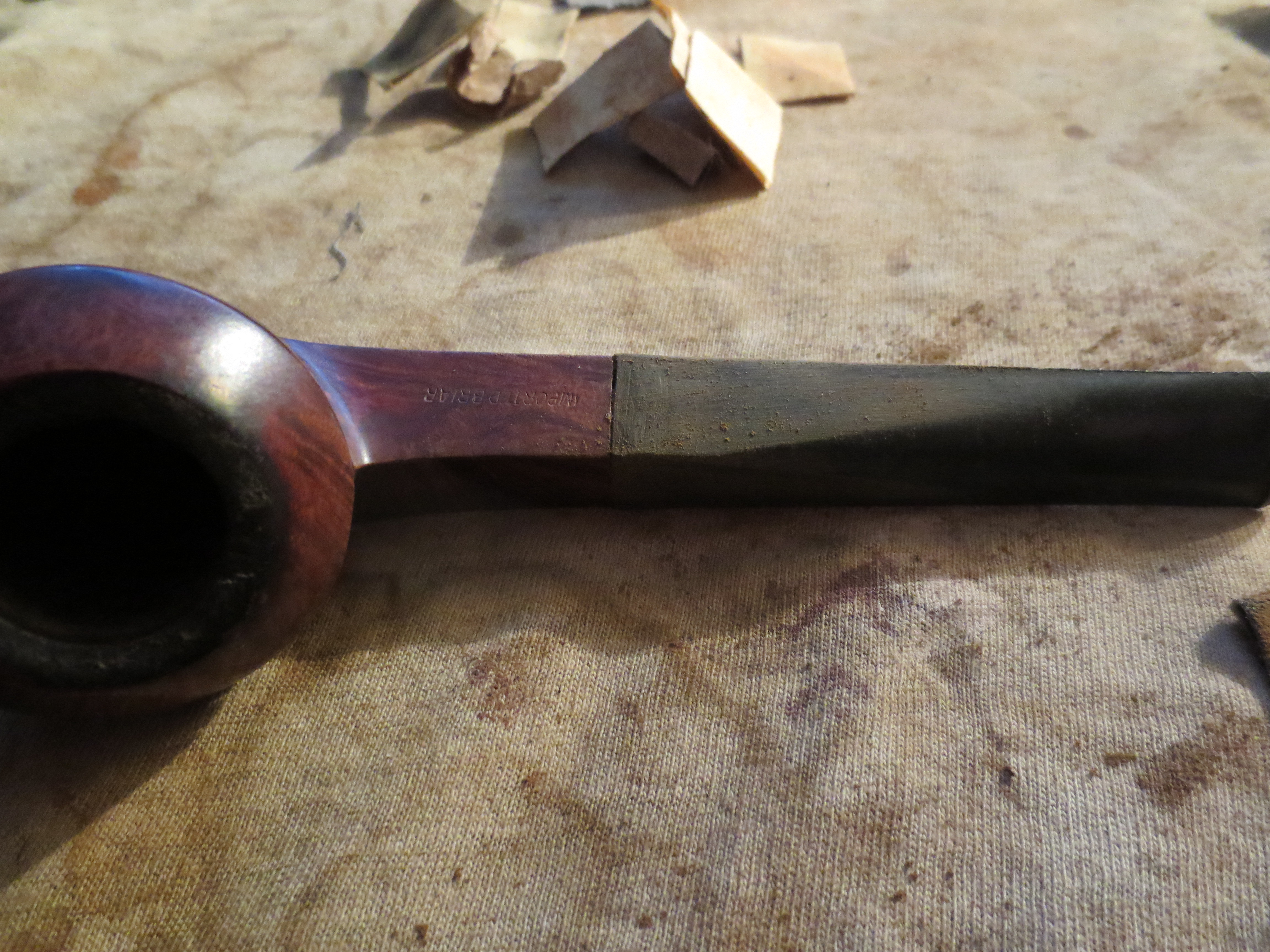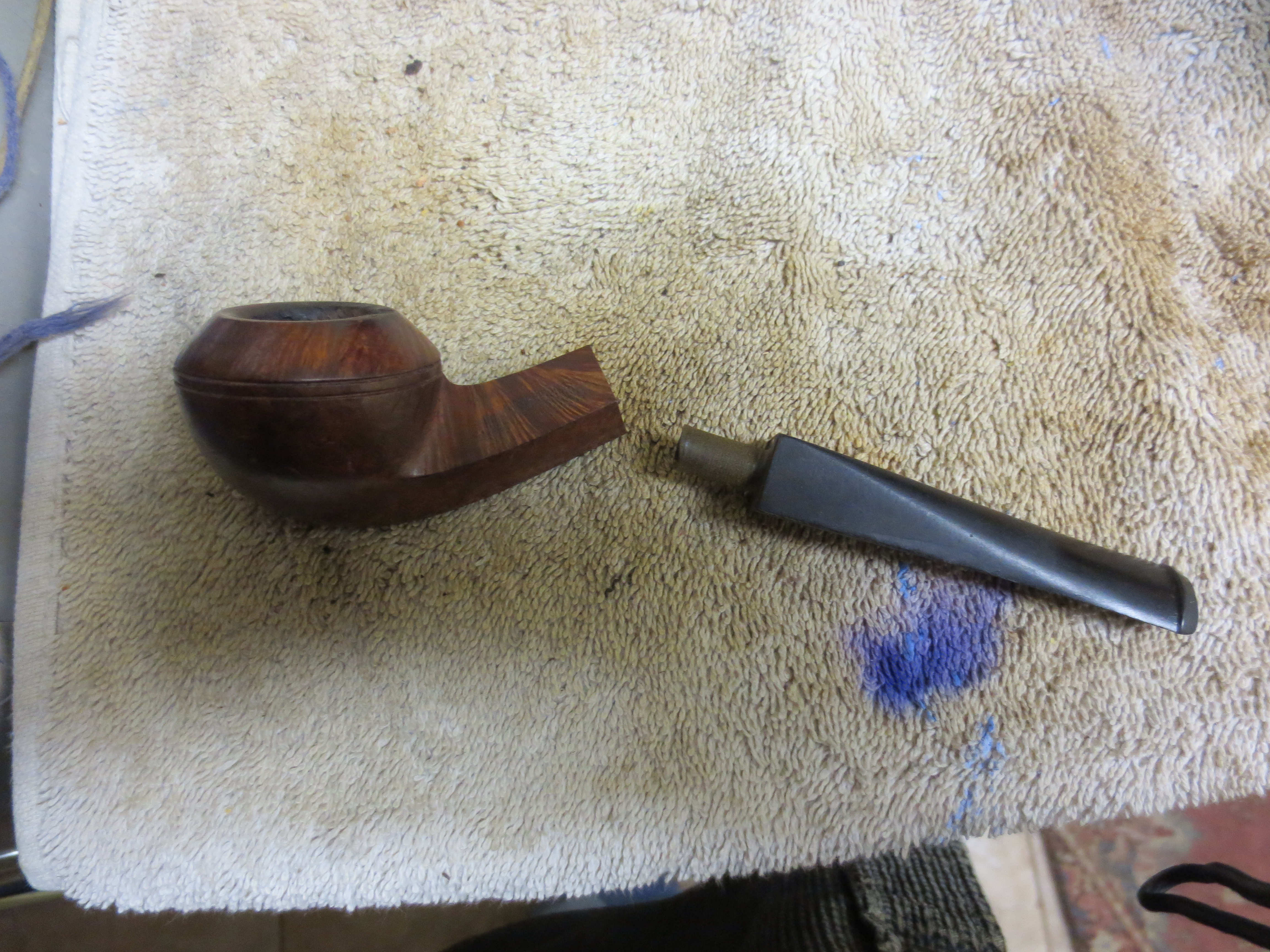 This little bent bulldog is the last of the briar stummels in the EBay lot I picked up. It is a nice little dog and I saved it for last as I find that the diamond shank stems are a bear to fit correctly. Bent diamond shanks are even harder in my opinion. I had quite a few stems to choose from in my can of stems so a new stem was not a problem. The issue really was getting all the sides and angles to line up and look right. Restemming these is a tricky proposition. This one had crosshatched stamping on the left side of the shank that obliterated the stamping of the name on it. On the right side it is stamped Imported Briar which I am assuming makes it an American made pipe. It had some nice grain under the dark stain and varnish coat. The bowl had a very poorly formed cake with many chunks missing. The rim was thick with a tar and oil build up but surprisingly was not dented or damaged by burns or over reaming. The end of the shank which would butt up against the stem was pristine with no damage or cracks. I love it when I can work on a pipe that does not need banding. It is a challenge to get a good clean fit on the stem. This would thus be a double challenge.