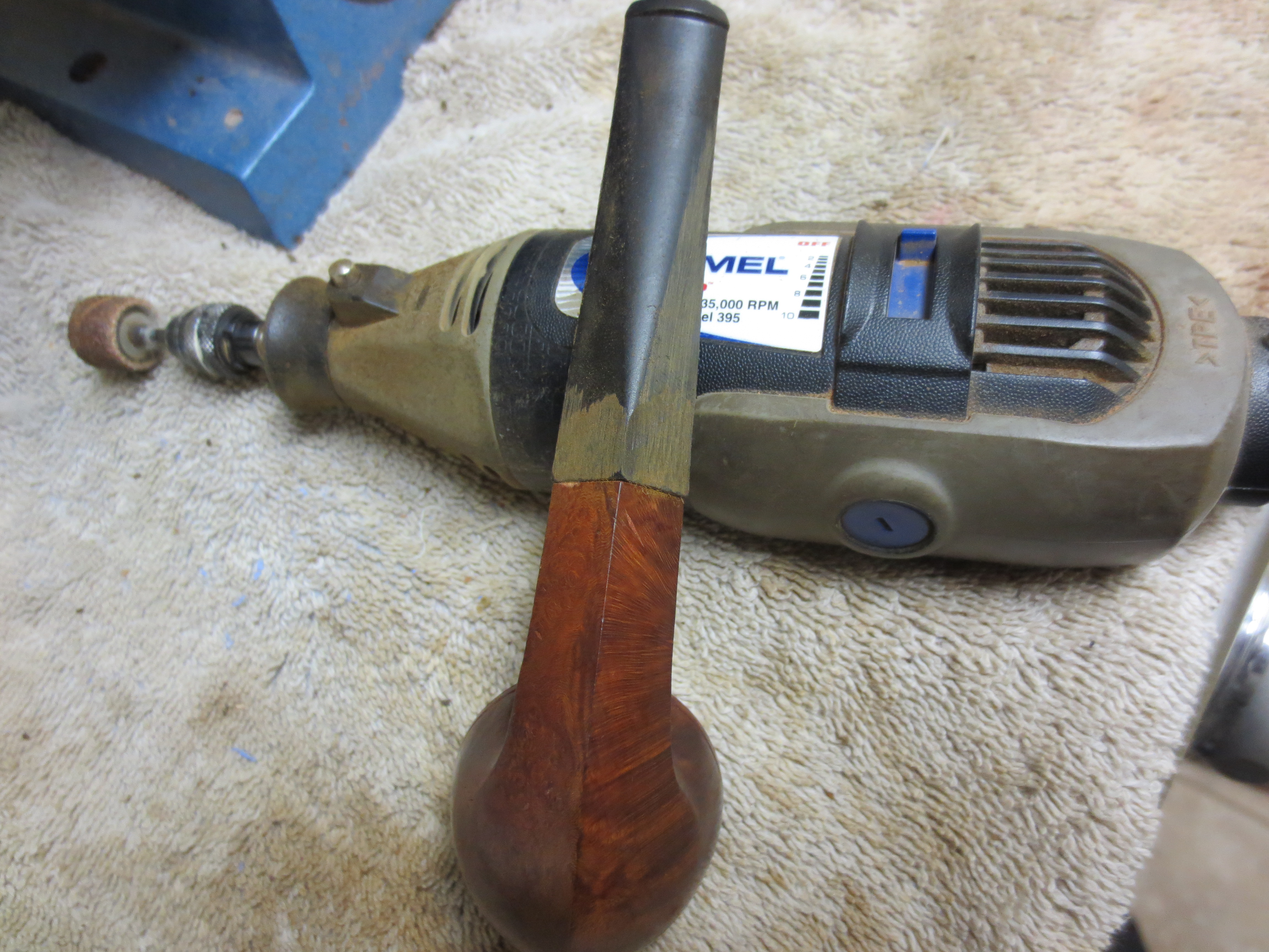I used my Dremel with a sanding drum to bring the sides of the stem down to almost match the shank. This was a bit tricky in that I did not want to cause dips in the surface of the stem but reduce each side until it was a close fit to the shank. It takes a light touch on the sanding drum to keep it horizontal to the stem and also keep it from hitting the shank and doing damage to the briar. I held the bowl in hand and worked the sanding drum both vertically and horizontally to the stem to remove the excess vulcanite. I worked on one side at a time until the fit was close then turned the stem and did the next side. I began on the top side of the stem and worked both top sides before turning the stem over and doing the underside. The next three photos show the shaping done by the Dremel. After doing this initial work on the stem it was time to take to the table and do the rest by hand.
