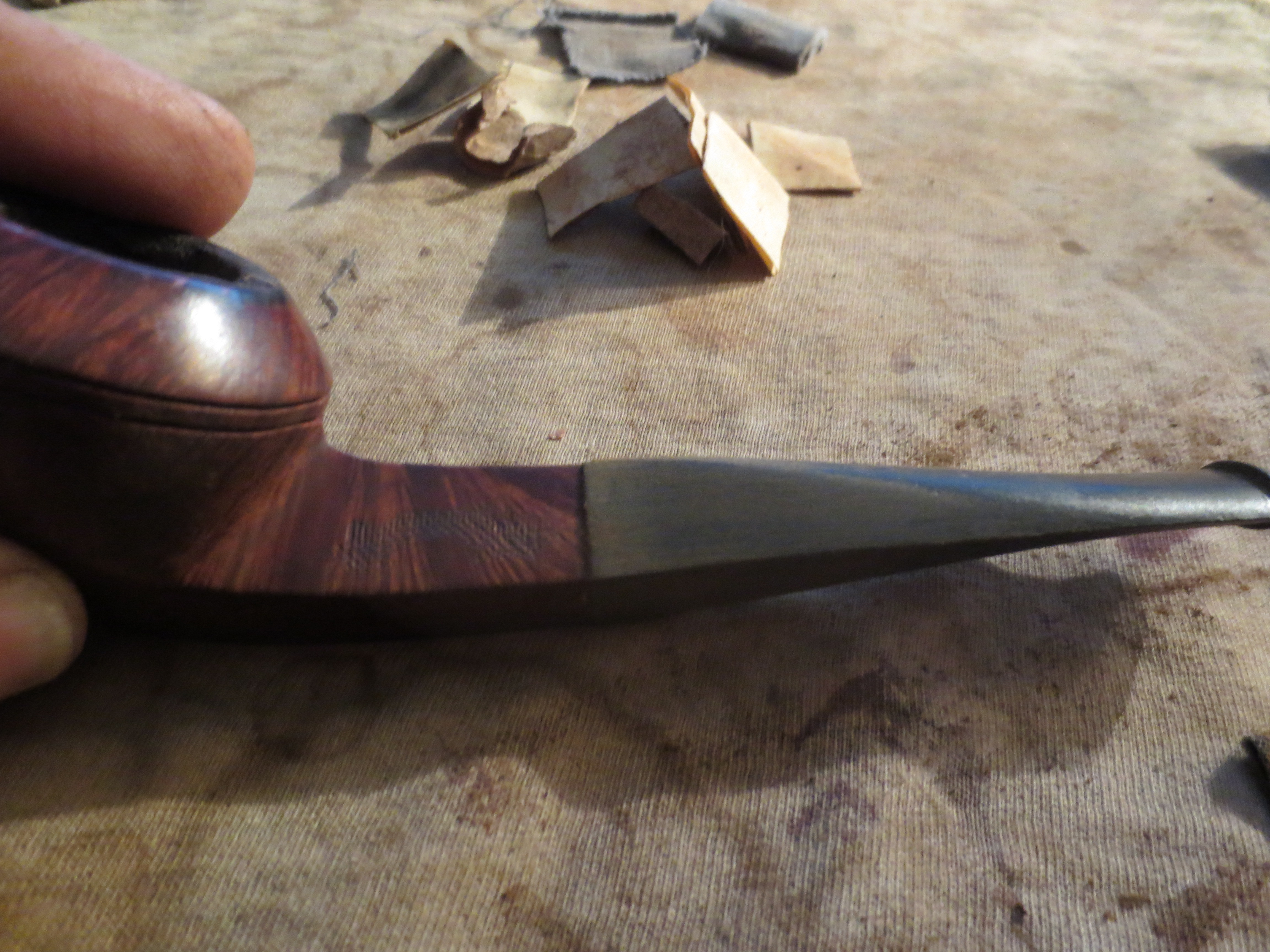 I went on to sand the stem with a fine grit emery paper to continue to bring the size down to meet the shank on the pipe (Photos 1 & 2). After I had the stem fairly close I switched to 320 grit sandpaper and sanded down the stem, the shank and the bowl. I decided to remove the cross hatching on the shank and clean up the finish. I wiped it down with acetone on a cotton pad to remove the finish and sanded until the finish was stripped and the shank and stem was smooth. The flow between the stem and the shank was a good match when I finished with this part of the work (Photos 3, 4, 5, & 6). An amazing grain was beginning to break out on the bowl and shank.