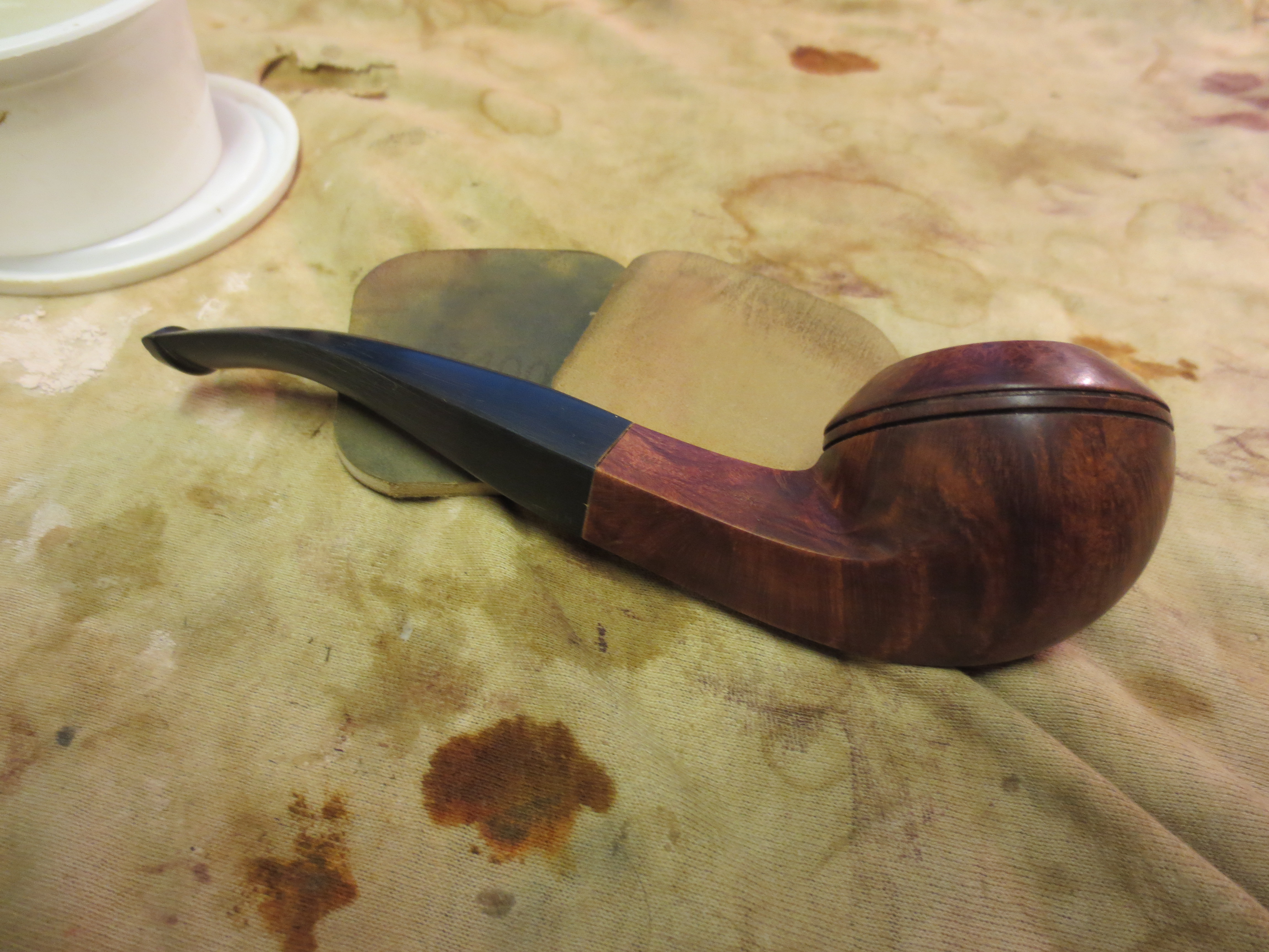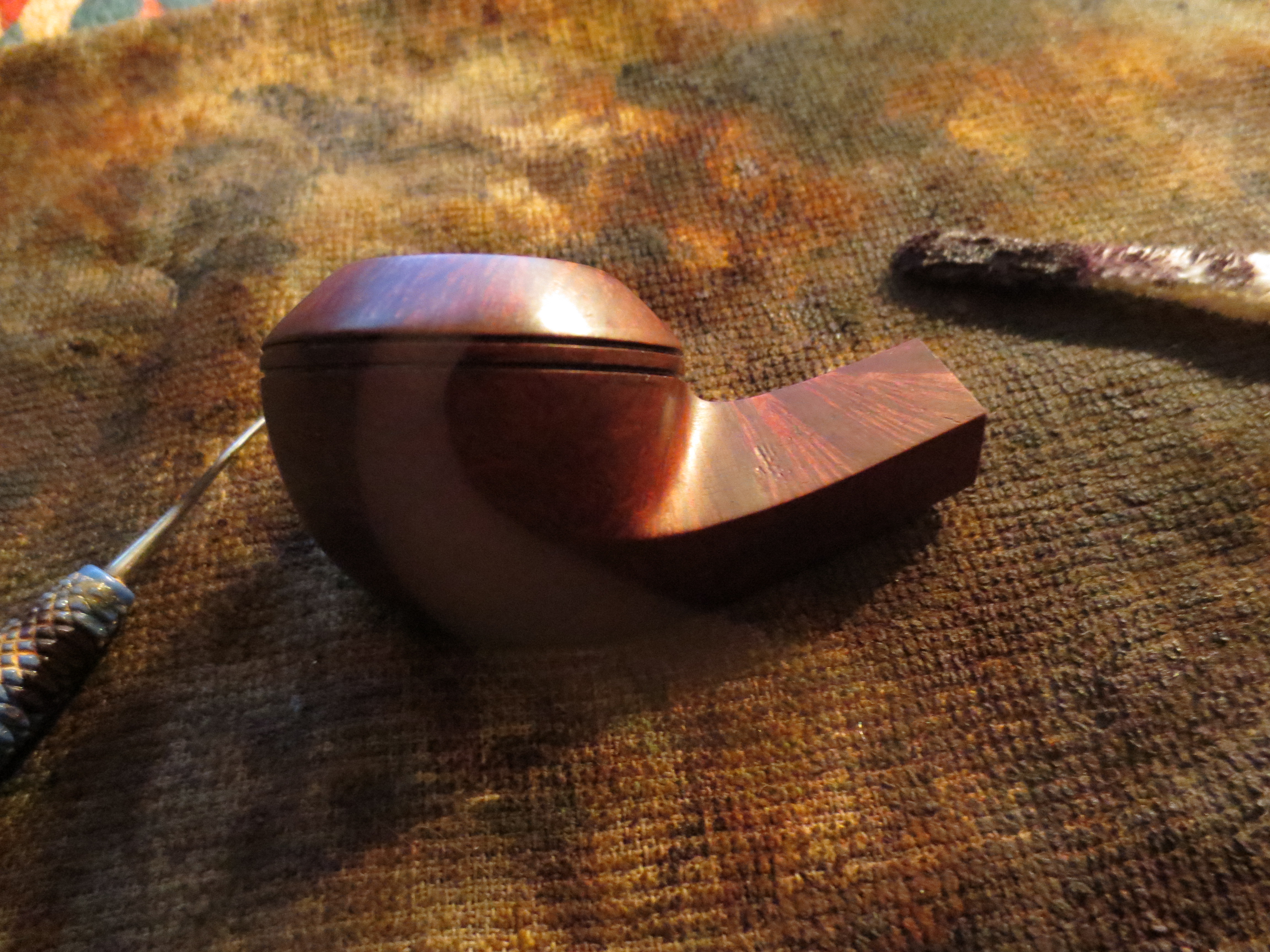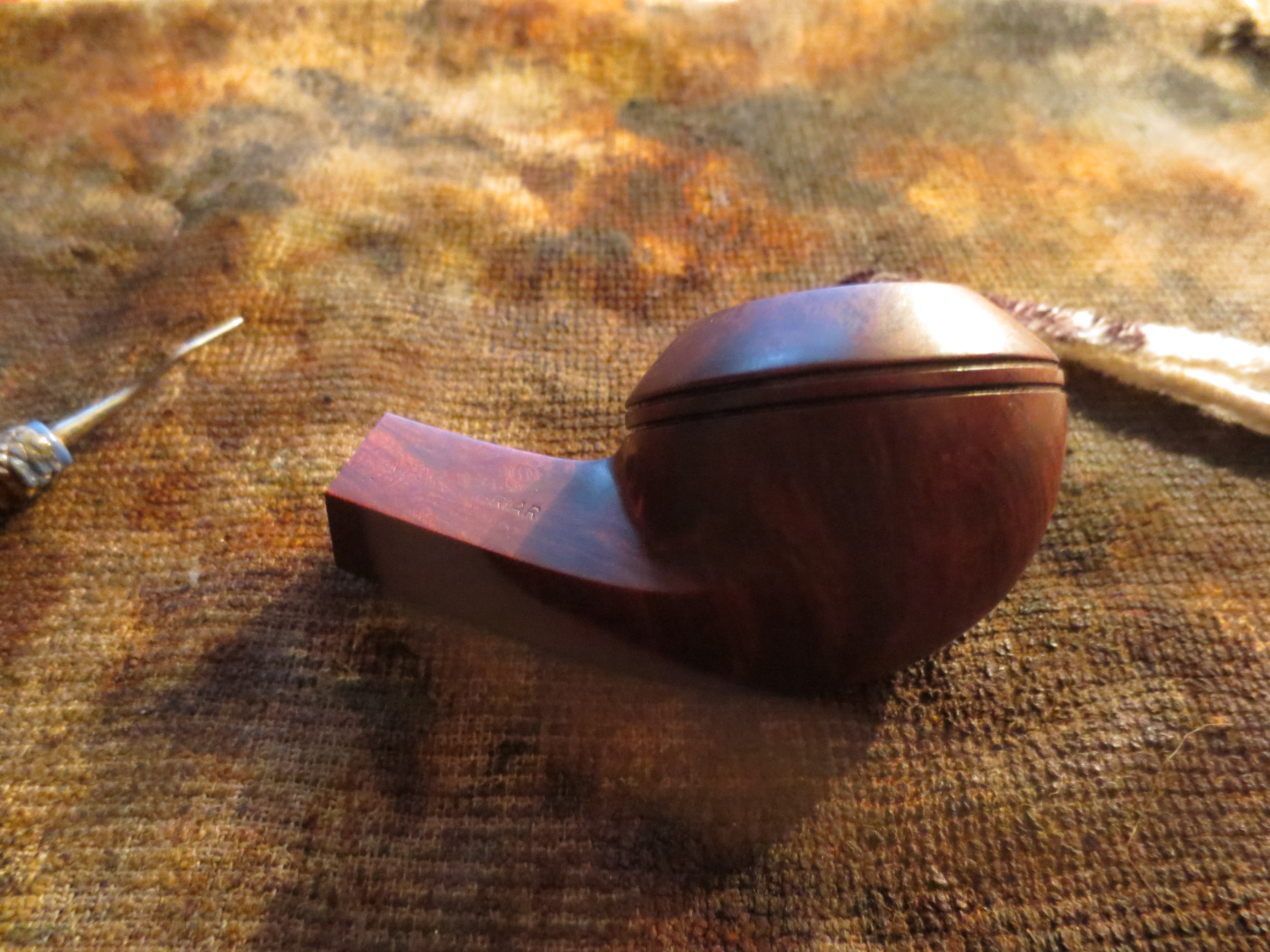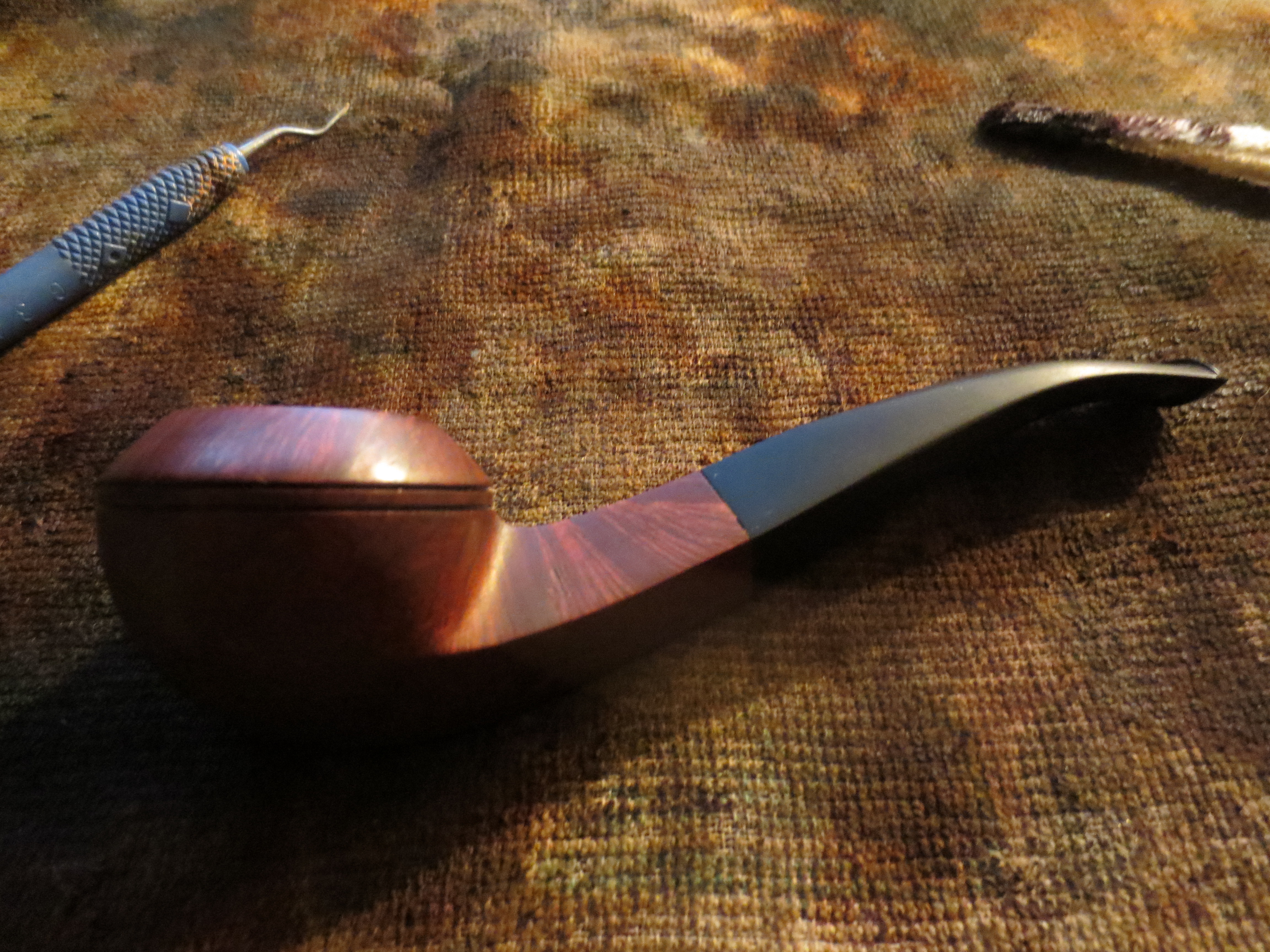 I buffed the pipe with White Diamond and then gave it multiple coats of carnauba wax to finish it. The finish came out nicely in my opinion and the feel of the pipe in the hand was perfect. I had to load a bowl of tobacco and give it a new inaugural smoke. I chose to load it with some 2009 Barclay-Rex Barclay Slice. I packed the bowl, picked up a tamper and lighter and headed outside into the yard with my spaniel. While he ran around and chased sticks and chewed them I relaxed and had a bowl. It is a great smoking little pipe. It is comfortable in the mouth and has an open draught. I like it. Now I need to decide whether to keep it or pass it on.