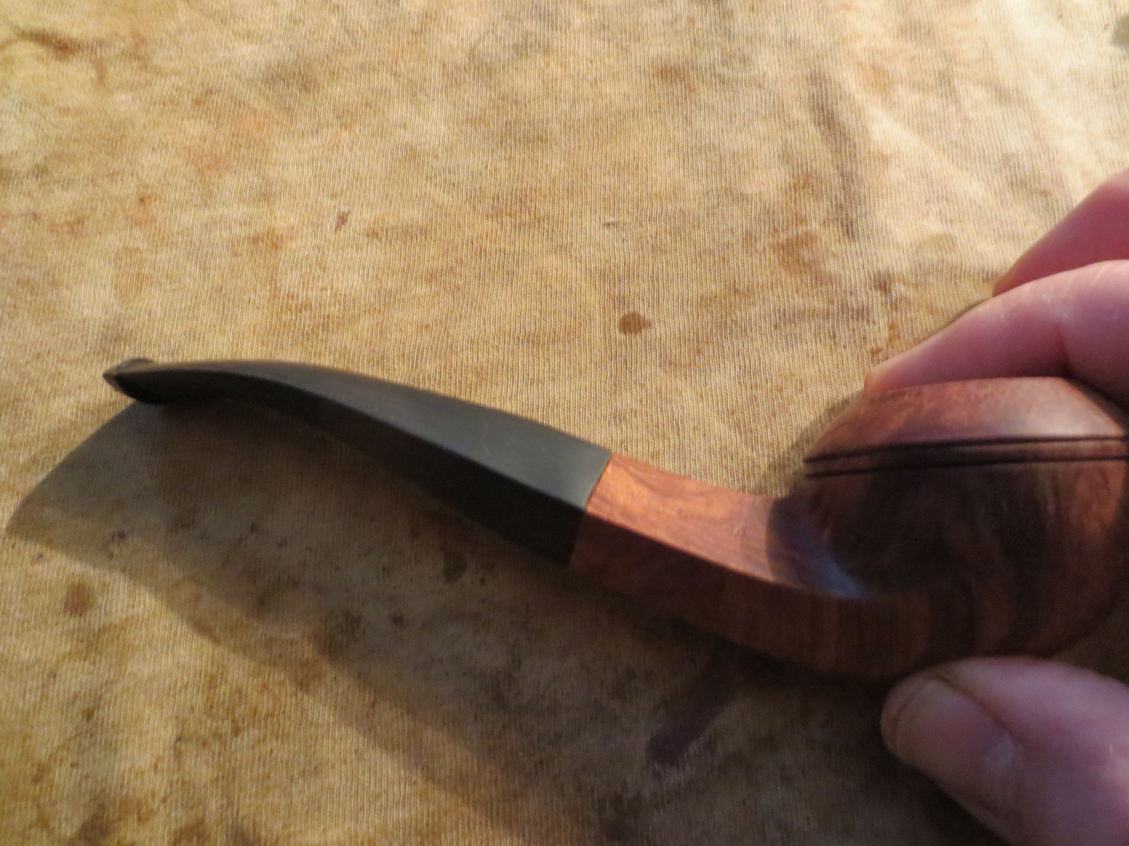 At this point I decided to bend the stem to the angle I wanted on the finished pipe. I set up my heat gun and turned it on to the lowest setting and held the stem above the heat until it was pliable. I have a wooden rolling pin that I use as a guide to bend the stem evenly so once it was soft I bent it over the rolling pin until the angle of the stem bend aligned with the curve of the bowl. I wanted the bowl to be level when held in the hand. Once the angle was right I cooled the pipe stem in cool water to set the bend. The next four photos show the stem after it was bent according to the angles I was aiming for. The grain on this pipe was calling out to me to come up with a stain colour and process that highlighted the grain.