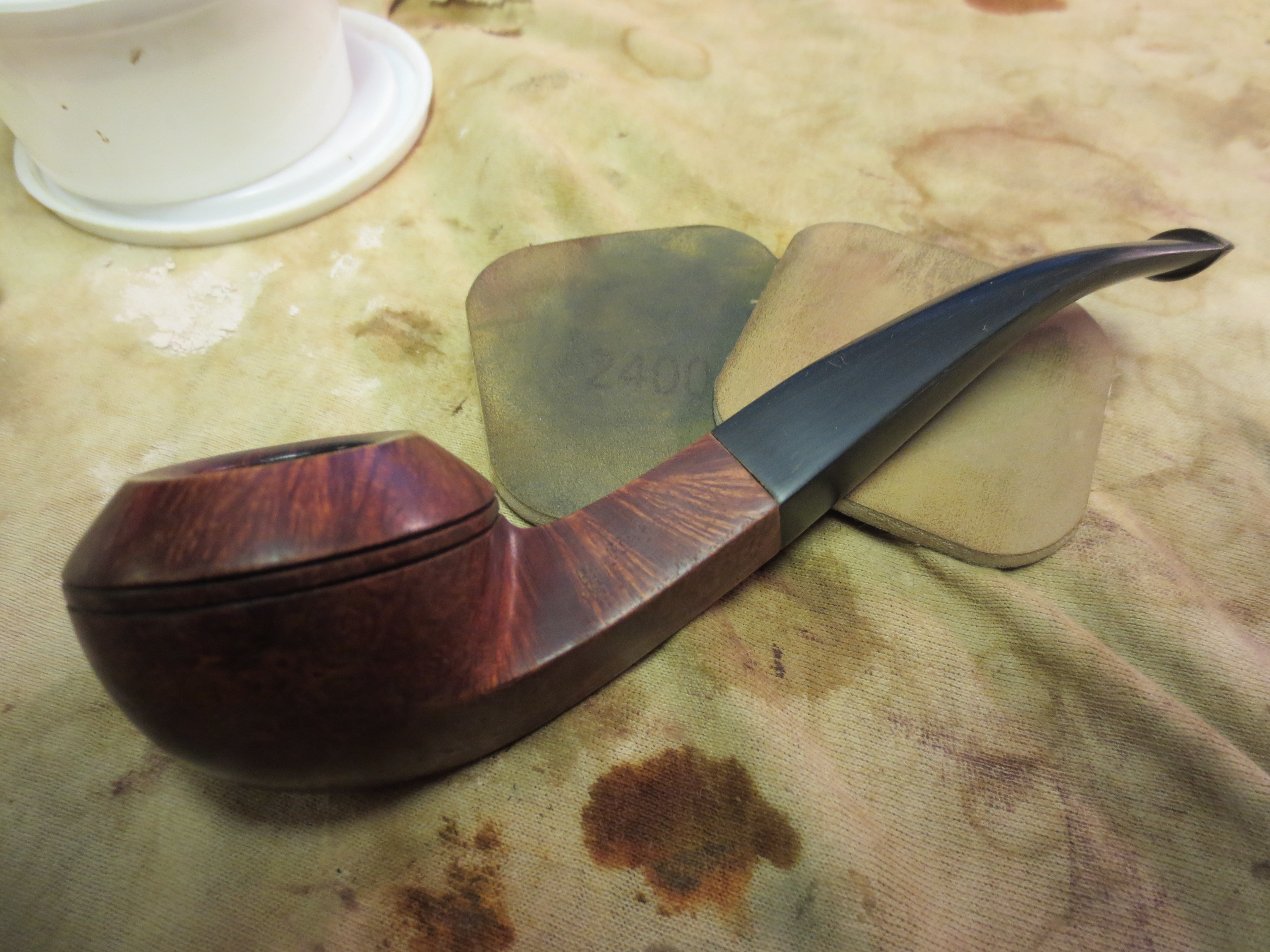 I reinserted the stem at this point in the process and hand buffed the bowl to get a good feel for the opacity of the stain (Photos 1 & 2). I then began to sand the stem and the bowl with the micromesh sanding pads. I began with 1500 and 1800 grit micromesh first. I wet sanded with these grits of micromesh (Photos 3, 4, & 5). The finish on the stem is smoothing out and the bowl finish is really beginning to show the grain and highlight the beauty of the piece of briar.