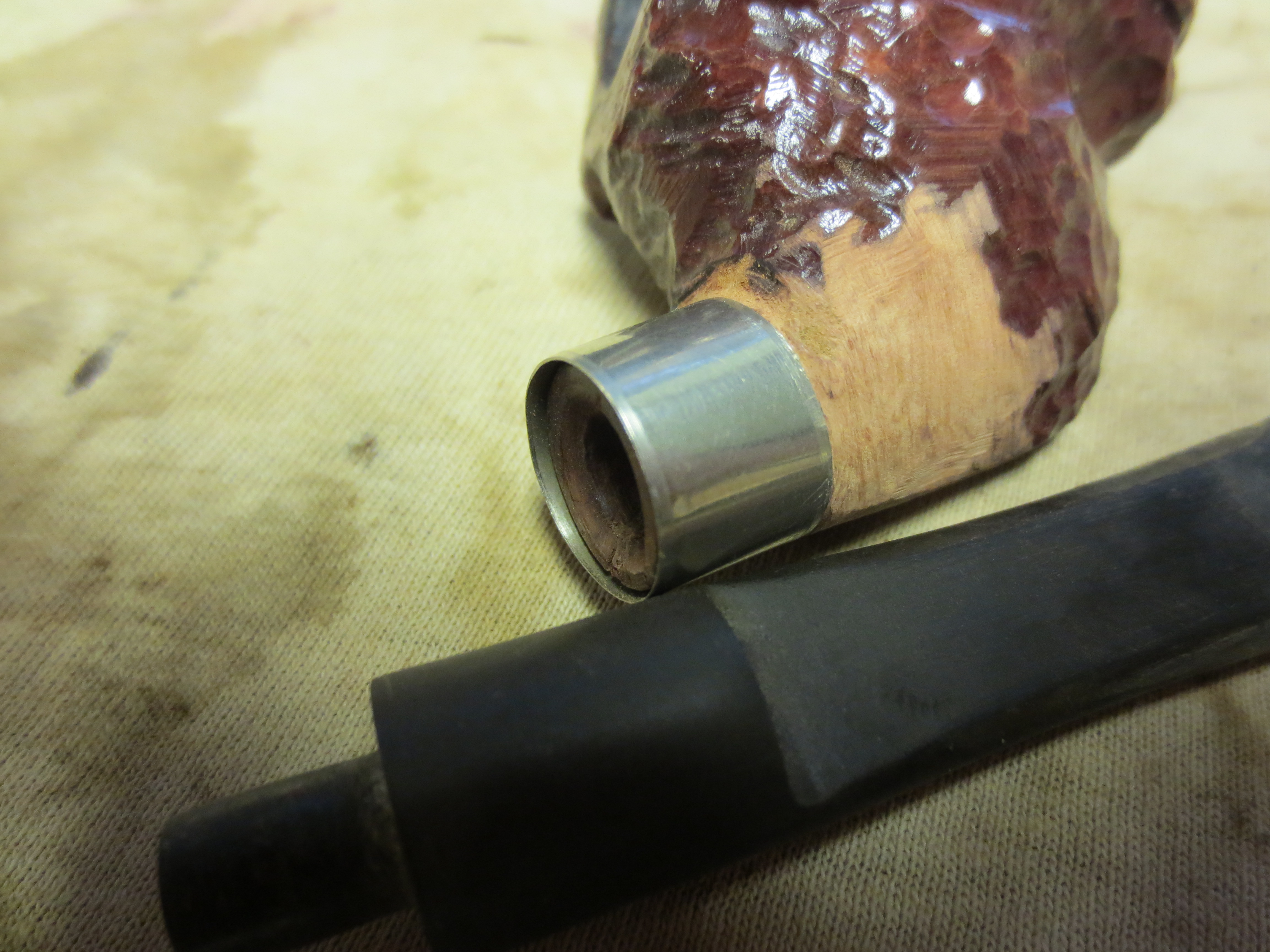 I used my Dremel to sand back the shank area so that a band would fit it. I sanded back the neck of the bull to allow for a visible shank. I also had to sand the area at the back of the head to fit the band on the shank. I sanded it with some medium grit emery paper to remove the deep scratches from the Dremel and then worked it over with 240 and 320 grit sandpaper to smooth it out. I finished by wet sanding the shank with micromesh sanding pads from 1500-3200 grit. Once I had it cut back and ready, I heated a band with my heat gun and pressure fit it onto the newly formed shank. The next three photos show the newly banded shank. I left a little excess length on the band so that it would form a seat for the stem (visible in Photo 2). The shank end was so badly damaged that I could not get a smooth end on it. In Photo 3 you can also see the cracks in the shank that I repaired with superglue and pressure.