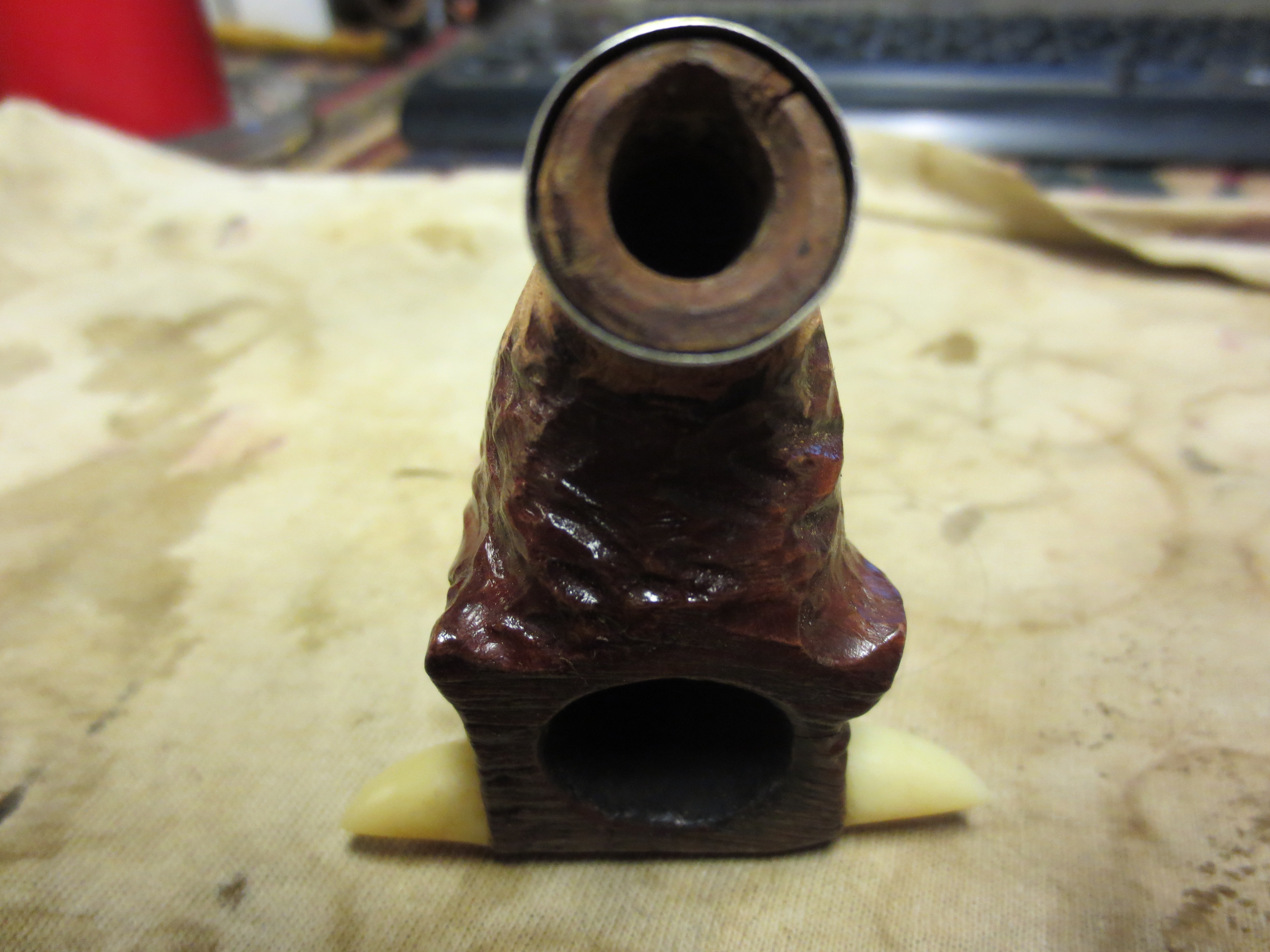 I have never been a big fan of carved animal pipes- whether birds, bulls, horses, etc. There is just something about them that always makes me shy away. Needless to say when I picked up this one in an EBay lot I put it in the bottom of the box of pipes to be refurbished and kept burying it lower in the box. A few weeks ago when I had very few left I decided to give it a go. There were a few challenges about it that made it look interesting. It was without a stem and the shank was damaged – several cracks in it. The angles of the shank made banding it a challenge and the thickness of the neck of the bull at the base of the shank made it formidable. Those attracted me to giving it a try. I also figured I could do some carving on the shank to make it possible to band it and then sand rework an old stem to fit the newly carved shank. The bowl has some kind of impermeable coating on it. Acetone will not cut it; Everclear will not cut it and even a soak in the alcohol bath will not cut it. It is like a coat of Urethane. All my attacks on it resulted in not even damaging the surface. Ah well it will stay as it is then.