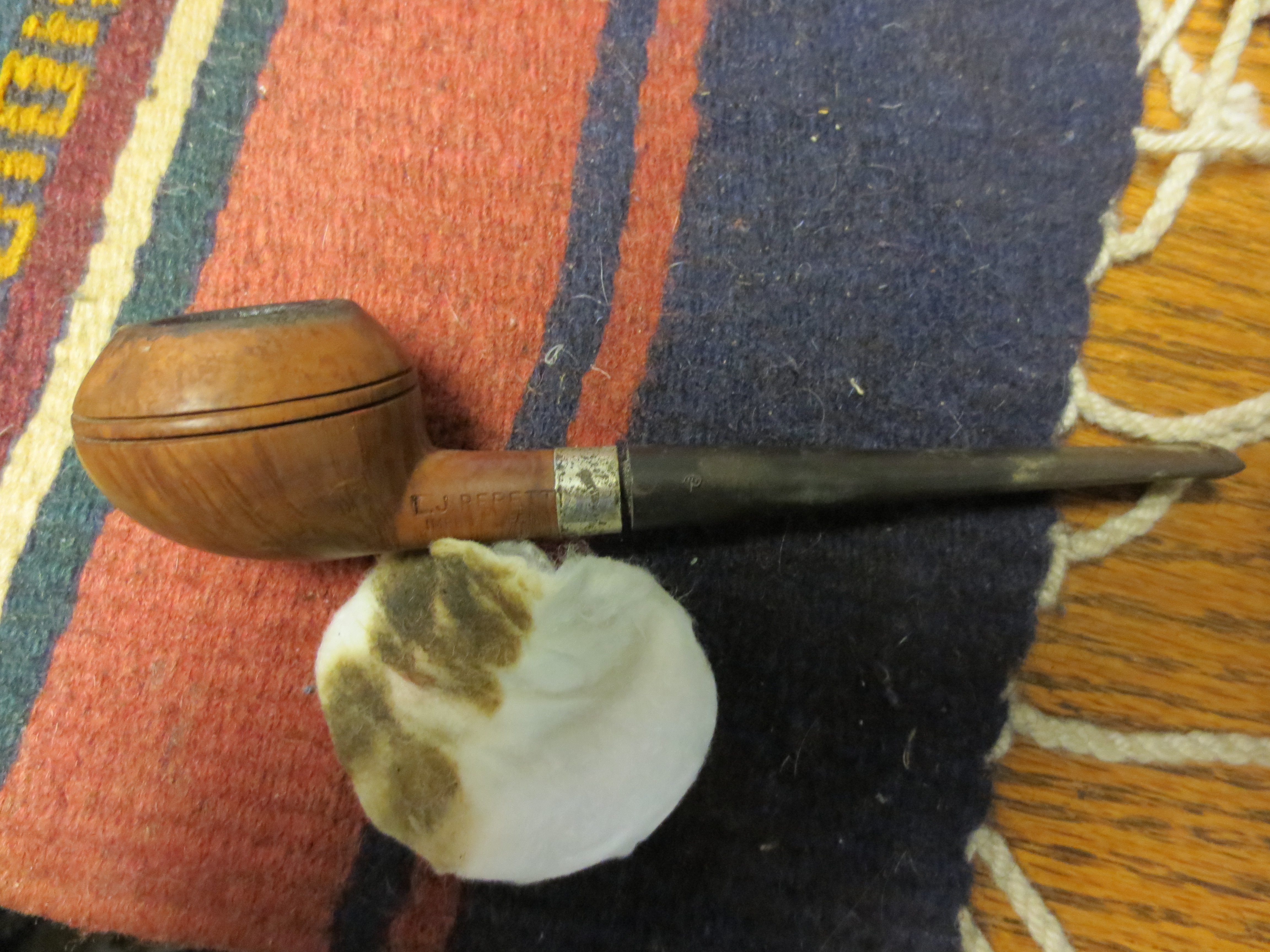 I learned from the last Perretti pipe that I worked on and subsequent replies that the Straight Grain was the top of the line of Perretti pipes. I have no idea where in the hierarchy this one sits but it is stamped L.J. PERRETTI over Imported Briar on the left side and DELUXE on the right side of the shank. It has a factory installed band that is stamped Sterling Silver in an arch. This pipe was a bit of a mess. Like some of the others I have had this one was marked with a swatch of paint – this time red paint. In the first photo below you can see it on the left side of the bowl near the shank bowl junction. The finish was rough but underneath was some great grain. Again there were no fills visible in this piece of briar. The bowl was caked and the lava had erupted over the edges of the rim leaving a thick hard cake on the rim of the bowl. The silver was badly tarnished and the stamping on the silver was not readable. The L.J. Perretti stamping on the left side of the shank ends with the “I” stamped on the silver band. The stem was oxidized and also had a buildup of calcification from the button up the stem about ½ inches. The stem was about a ¼ inch out of the shank and could not be pushed in from the buildup on tars in the shank. The first three photos show the state of the pipe when I brought it to the work table.