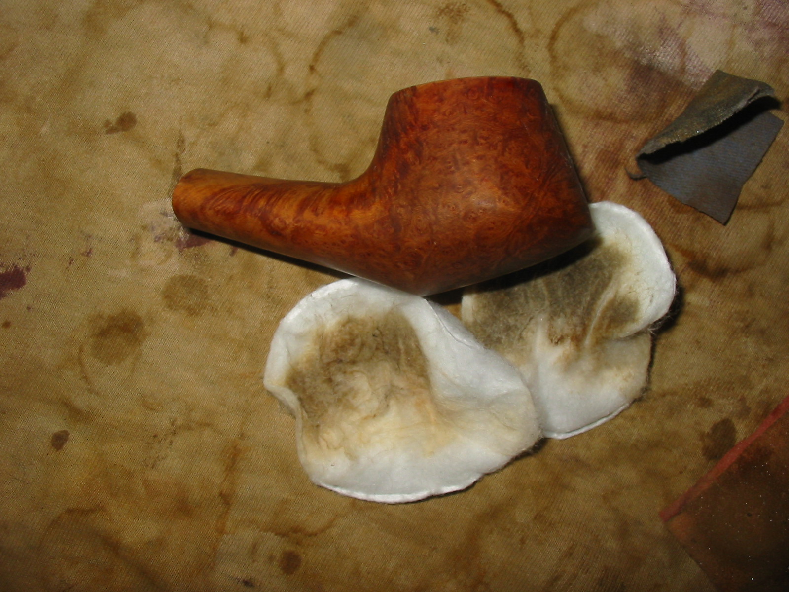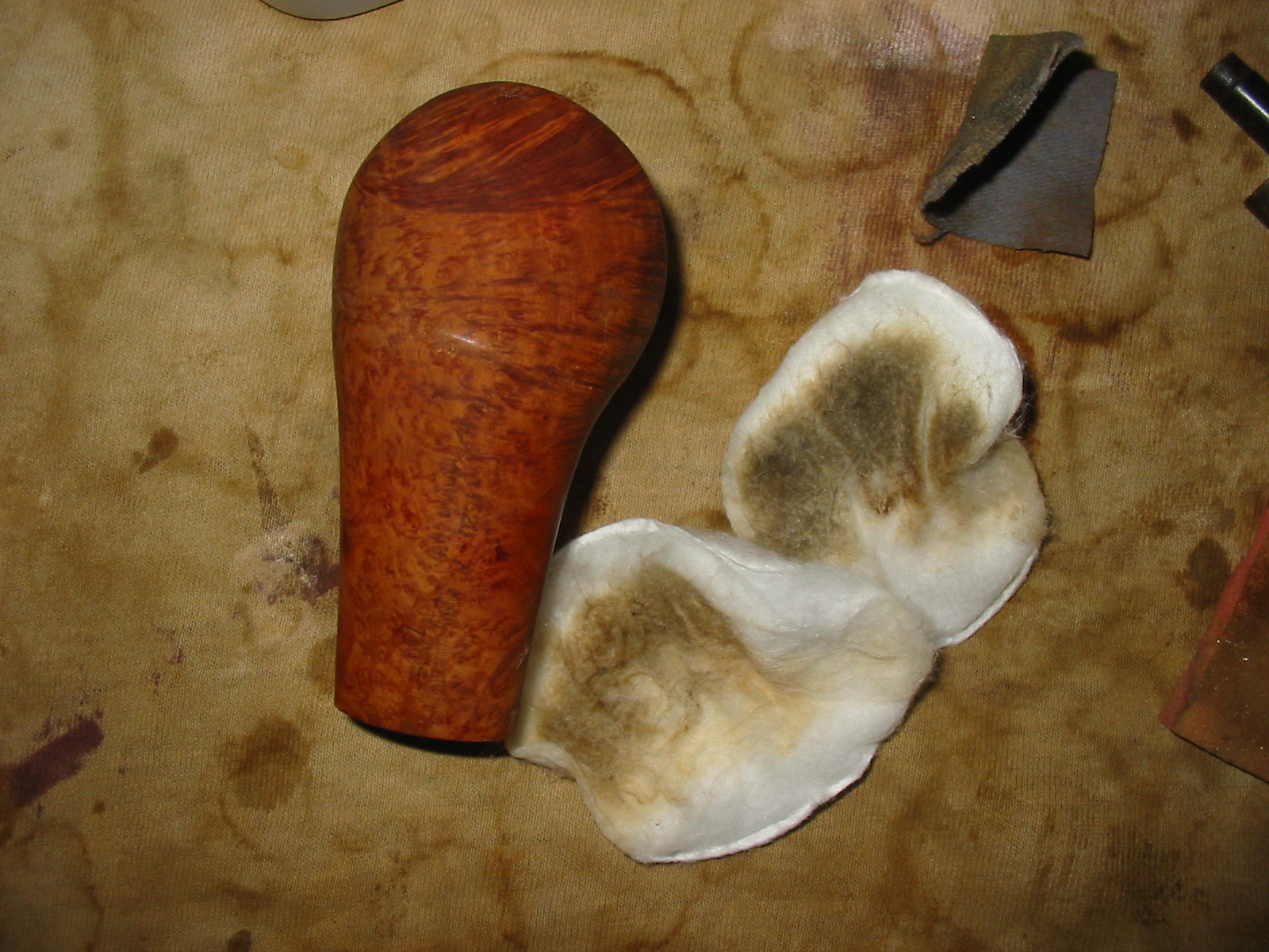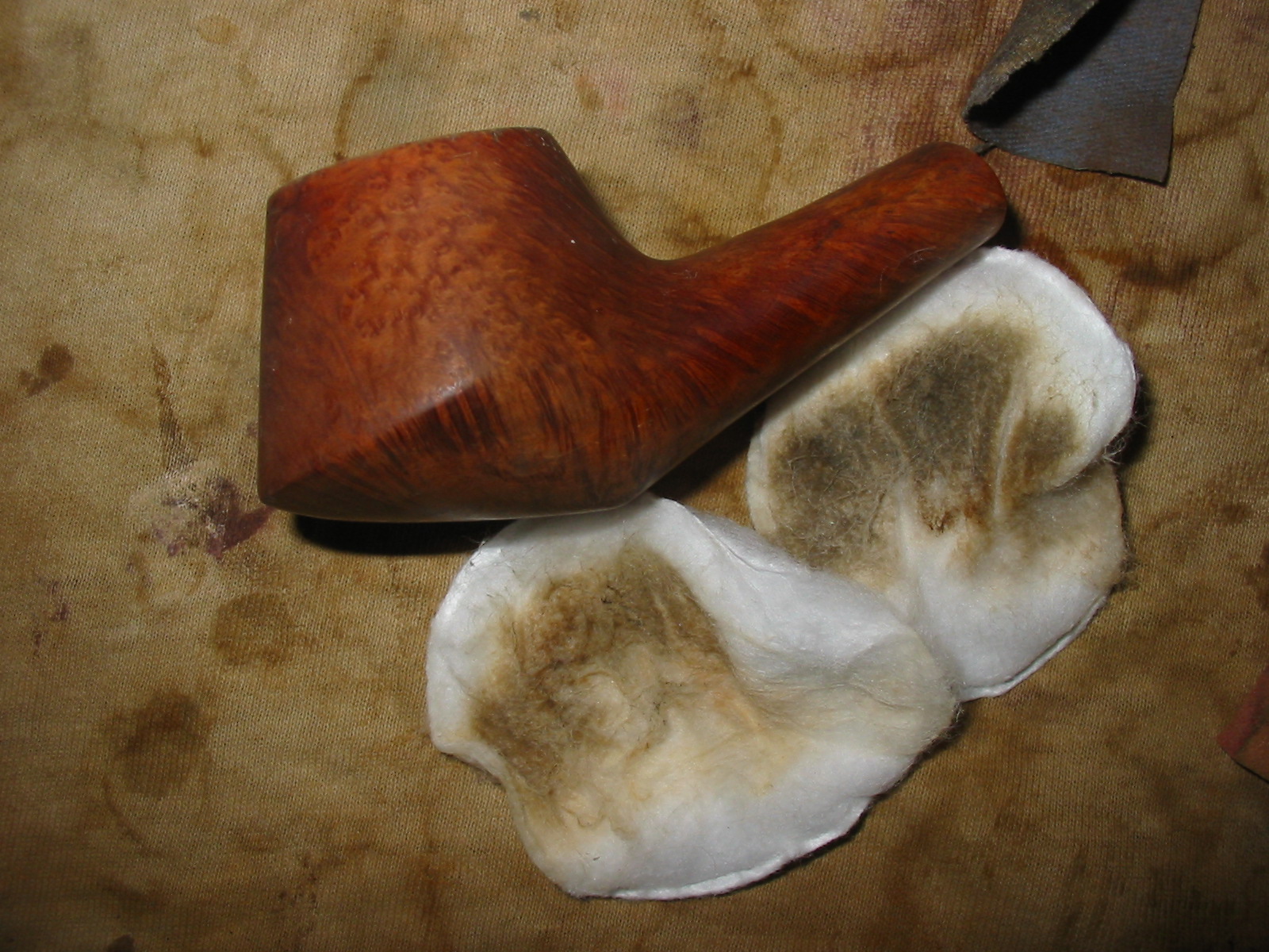 The next four photos show the bowl after I have wiped it down with acetone on a cotton pad. The darkening on the rim is growing fainter with each wipe. The pads are coloured from the dirt and grime as well as the stain from the pipe. I have found that the dark and medium brown wipe off and leave a yellow colour on the pads. I repeated the wipe down several times until the surfaces were clean.