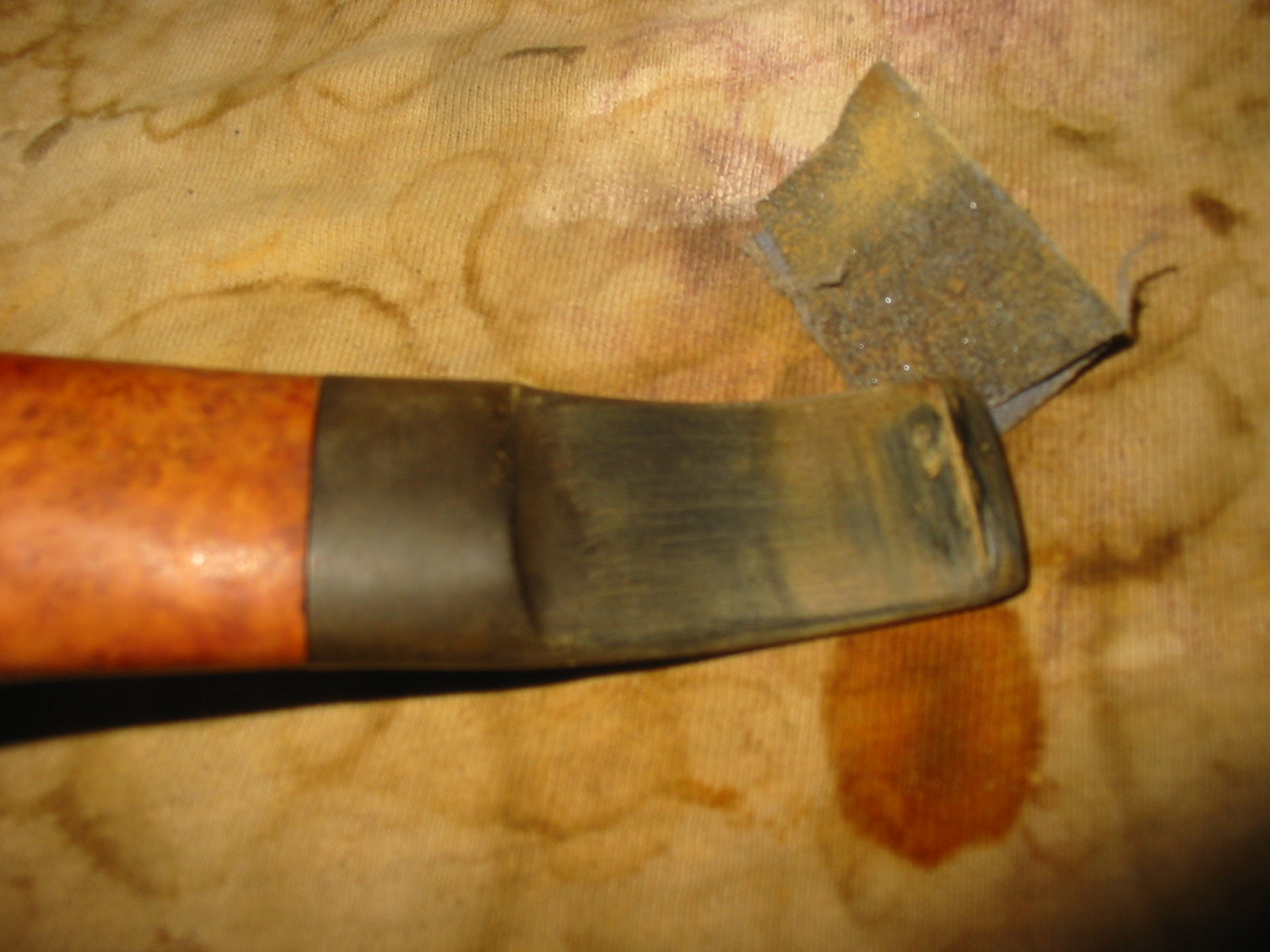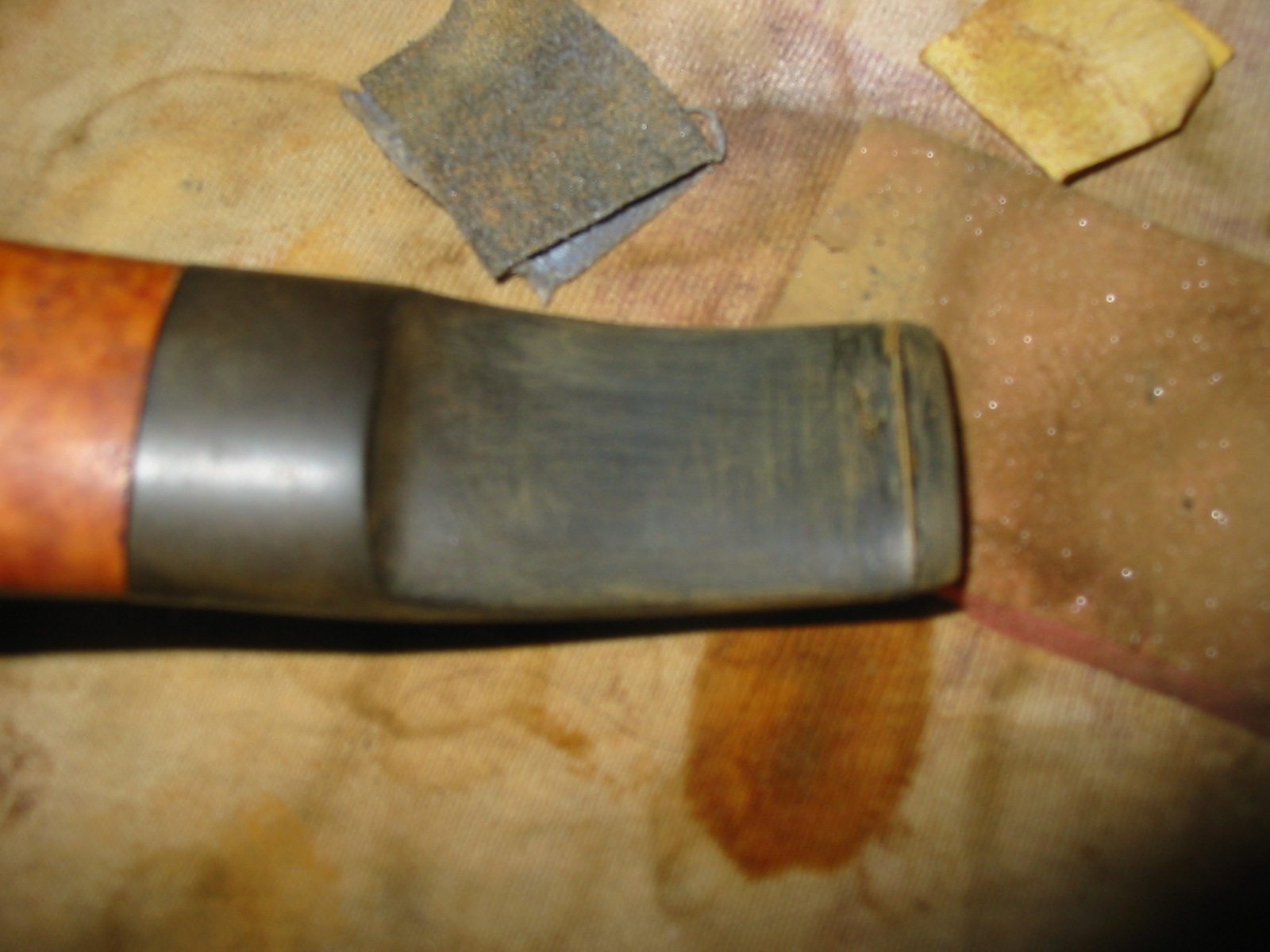 After wiping the bowl down I cleaned out the stem and the shank. I used pipe cleaners and Everclear to scrub out the insides of the stem and shank. I scrubbed until they came out clean. I worked on the area of the button slot to clean out the tar buildup in that area. Then I decided to work on the stem. I sanded out the calcification on the stem from the rubber stem bite protector. It leaves a white sediment buildup that is rock hard so I sand it with medium grit emery paper. Removing this buildup also reveals the depth and nature of the tooth marks in the stem. The first picture below shows the topside of the stem and the tooth marks. The second picture shows the underside of the stem and the two tooth marks next to the button.